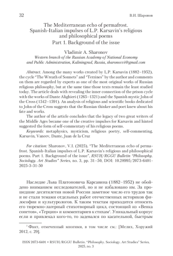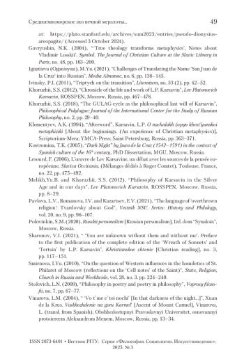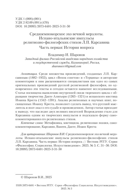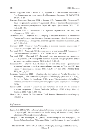 15. Шаронов 2021 - Шаронов В.И. «Незнаем ты без них и без меня»: Предисловие к первой публикации полной редакции «Венка сонетов» и «Терцин» Л.П. Кар савина // Христианское чтение. 2021. № 3. С. 117-151. https://doi.org/10.47132/1814-5574_2021_3_117.