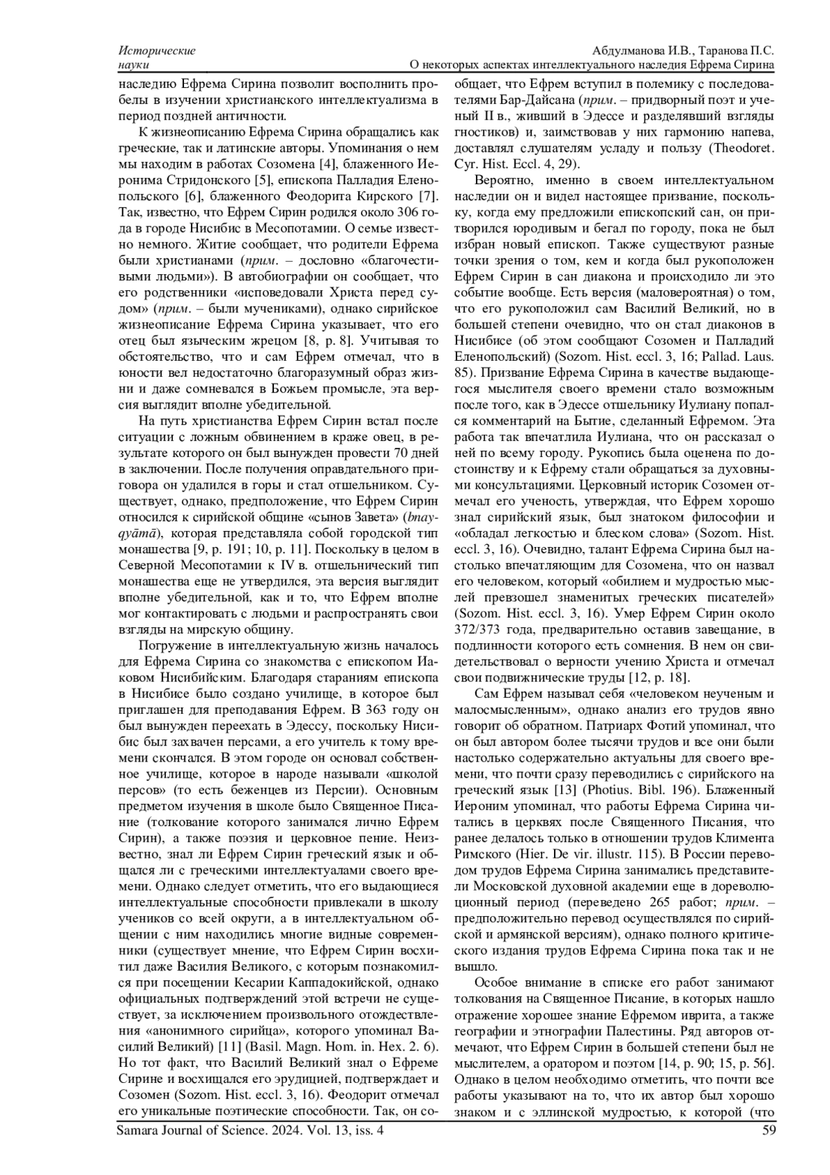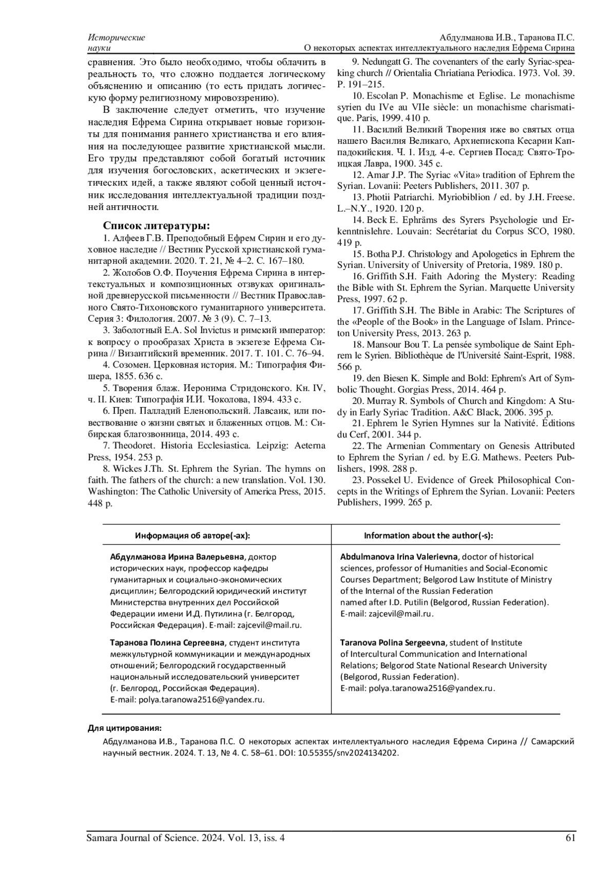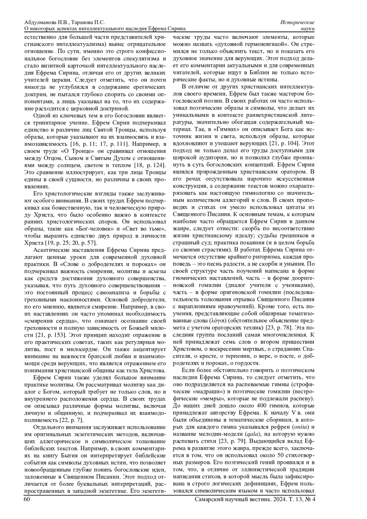 1. 	Алфеев Г.В. Преподобный Ефрем Сирин и его духовное наследие // Вестник Русской христианской гуманитарной академии. 2020. Т. 21, № 4-2. С. 167-180. EDN: YPDZCK