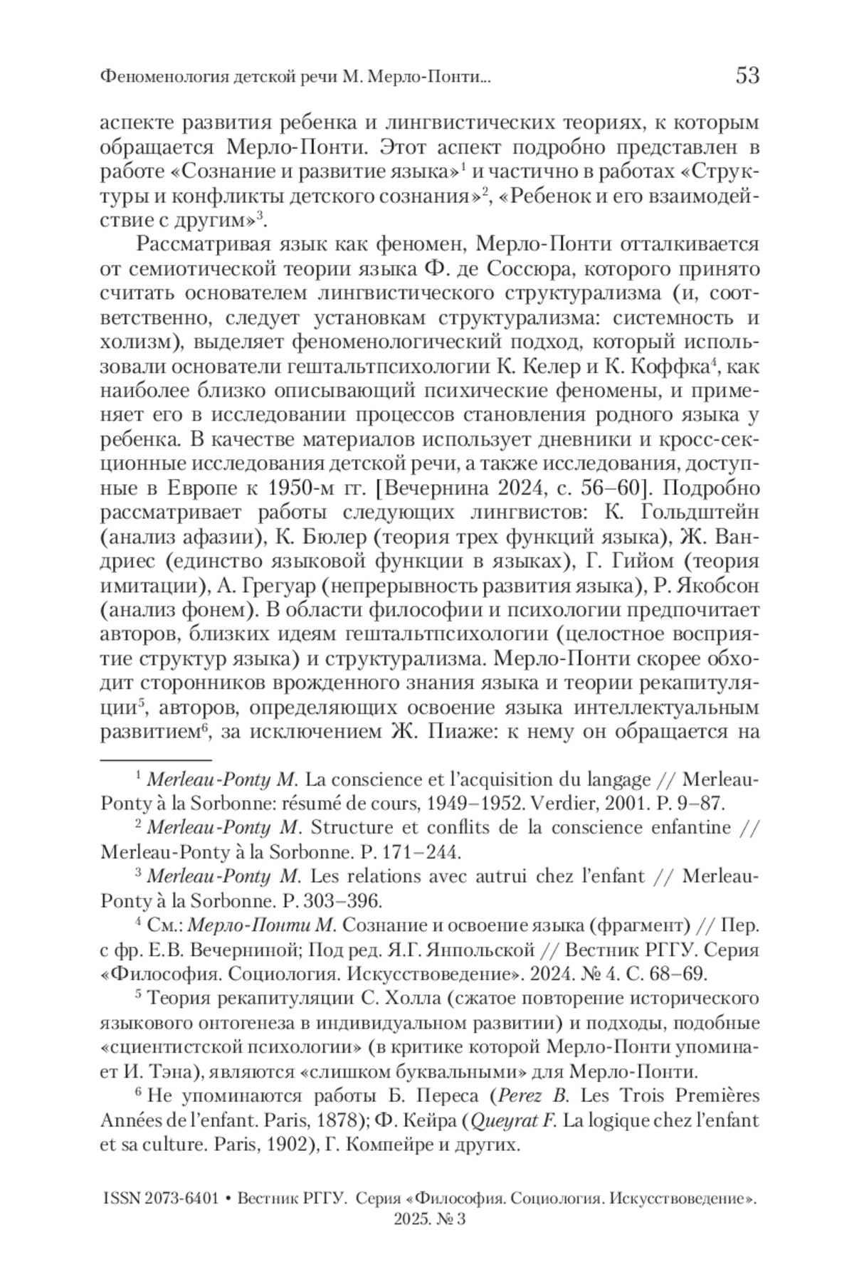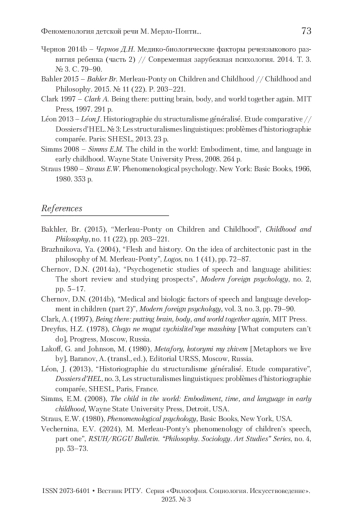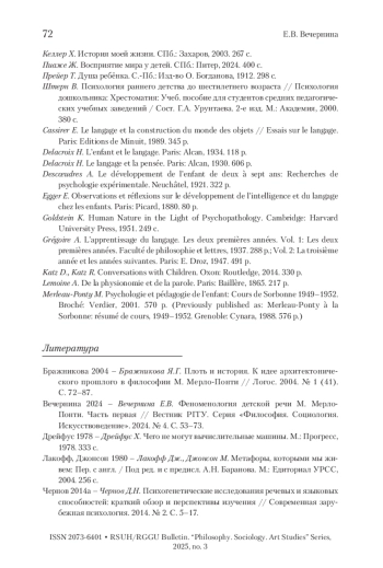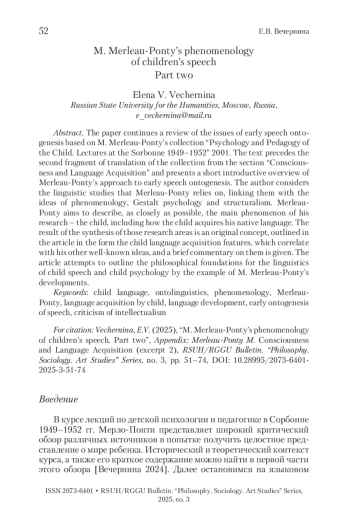 2. Вечернина 2024 - Вечернина Е.В. Феноменология детской речи М. Мерло-Понти. Часть первая // Вестник РГГУ. Серия «Философия. Социология. Искусствоведение». 2024. № 4. С. 53-73.