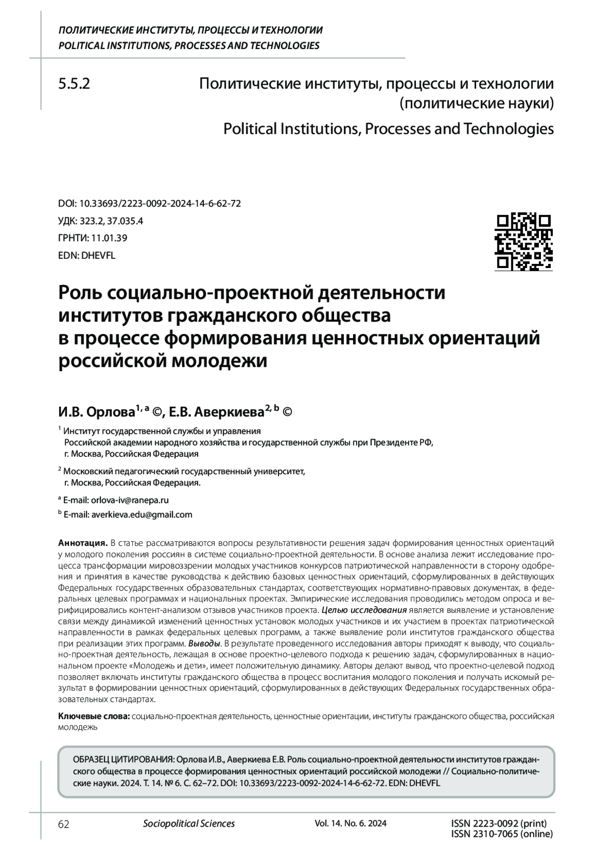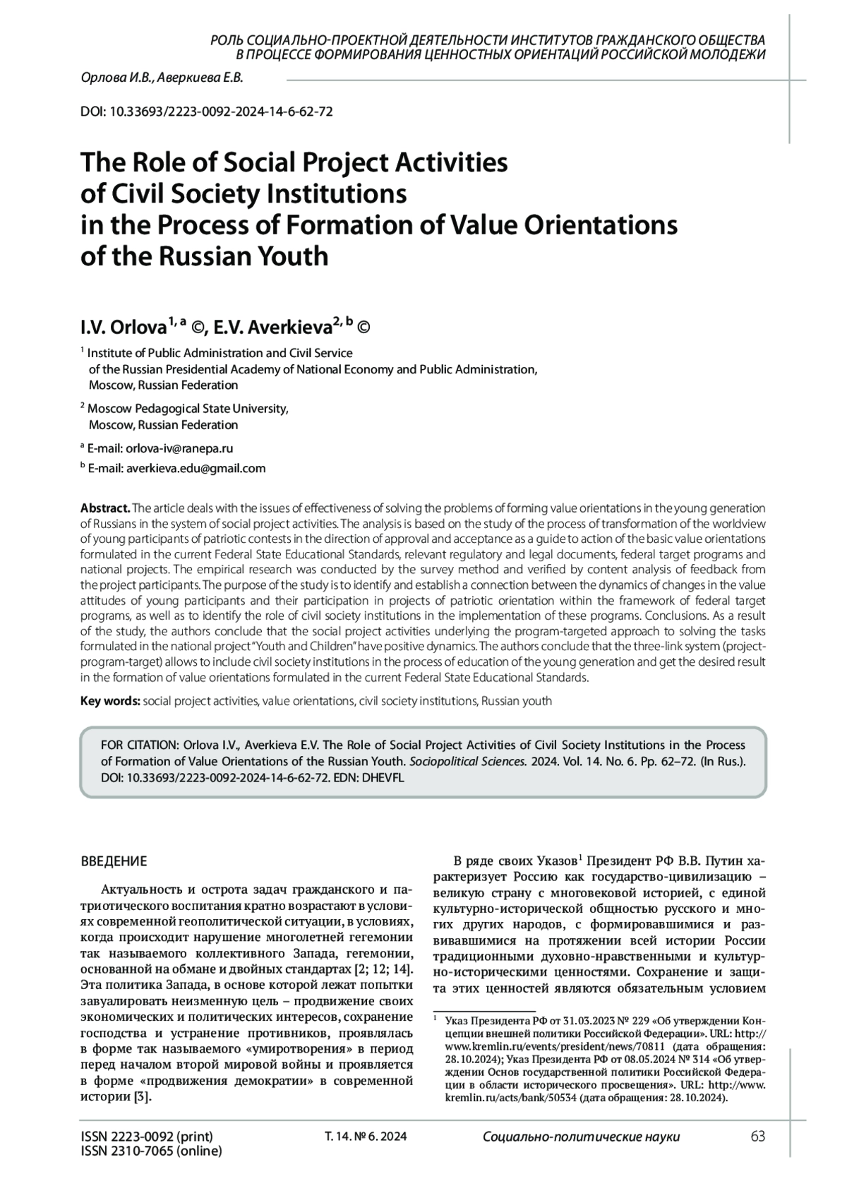 Rogachev S.V., Averkieva E.V. Institutes of civil society in the political socialization of Russian youth. Finance, Money, Investments. 2023. No. 4 (88). Pp. 31-38. (In Rus.). Х. DOI: 10.36992/2222-0917_2023_4_ EDN: QOTSFP