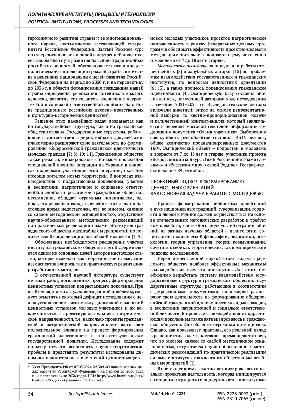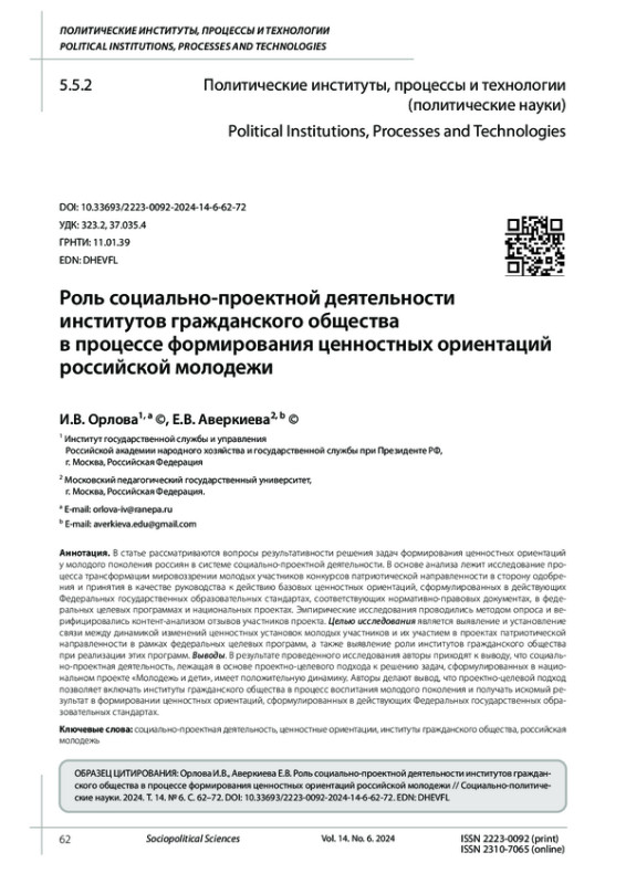 В статье рассматриваются вопросы результативности решения задач формирования ценностных ориентаций у молодого поколения россиян в системе социально-проектной деятельности. В основе анализа лежит исследование процесса трансформации мировоззрении молодых участников конкурсов патриотической направленности в сторону одобрения и принятия в качестве руководства к действию базовых ценностных ориентаций, сформулированных в действующих Федеральных государственных образовательных стандартах, соответствующих нормативно-правовых документах, в федеральных целевых программах и национальных проектах. Эмпирические исследования проводились методом опроса и верифицировались контент-анализом отзывов участников проекта. Целью исследования является выявление и установление связи между динамикой изменений ценностных установок молодых участников и их участием в проектах патриотической направленности в рамках федеральных целевых программ, а также выявление роли институтов гражданского общества при реализации этих программ. Выводы. В результате проведенного исследования авторы приходят к выводу, что социально-проектная деятельность, лежащая в основе проектно-целевого подхода к решению задач, сформулированных в национальном проекте «Молодежь и дети», имеет положительную динамику. Авторы делают вывод, что проектно-целевой подход позволяет включать институты гражданского общества в процесс воспитания молодого поколения и получать искомый результат в формировании ценностных ориентаций, сформулированных в действующих Федеральных государственных образовательных стандартах.