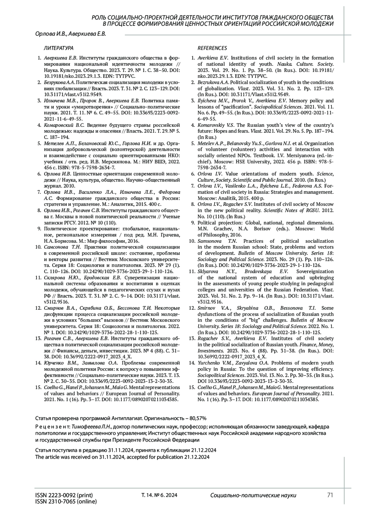 1. 	Аверкиева Е.В. Институты гражданского общества в формировании национальной идентичности молодежи // Наука. Культура. Общество. 2023. Т. 29. № 1. С. 38-50. DOI: 10.19181/nko.2023.29.1.3 EDN: TYTPVC