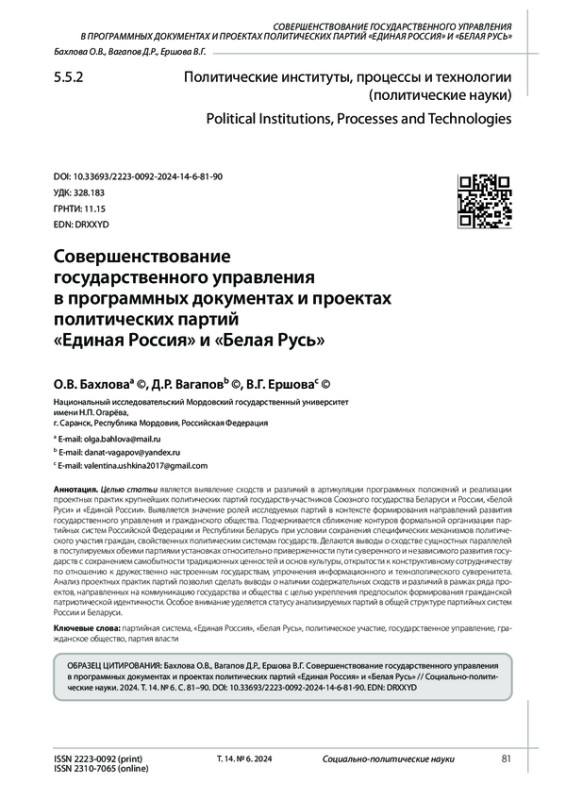 Целью статьи является выявление сходств и различий в артикуляции программных положений и реализации проектных практик крупнейших политических партий государств-участников Союзного государства Беларуси и России, «Белой Руси» и «Единой России». Выявляется значение ролей исследуемых партий в контексте формирования направлений развития государственного управления и гражданского общества. Подчеркивается сближение контуров формальной организации партийных систем Российской Федерации и Республики Беларусь при условии сохранения специфических механизмов политического участия граждан, свойственных политическим системам государств. Делаются выводы о сходстве сущностных параллелей в постулируемых обеими партиями установках относительно приверженности пути суверенного и независимого развития государств с сохранением самобытности традиционных ценностей и основ культуры, открытости к конструктивному сотрудничеству по отношению к дружественно настроенным государствам, упрочнения информационного и технологического суверенитета. Анализ проектных практик партий позволил сделать выводы о наличии содержательных сходств и различий в рамках ряда проектов, направленных на коммуникацию государства и общества с целью укрепления предпосылок формирования гражданской патриотической идентичности. Особое внимание уделяется статусу анализируемых партий в общей структуре партийных систем России и Беларуси.