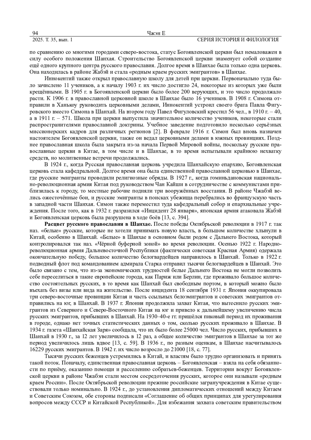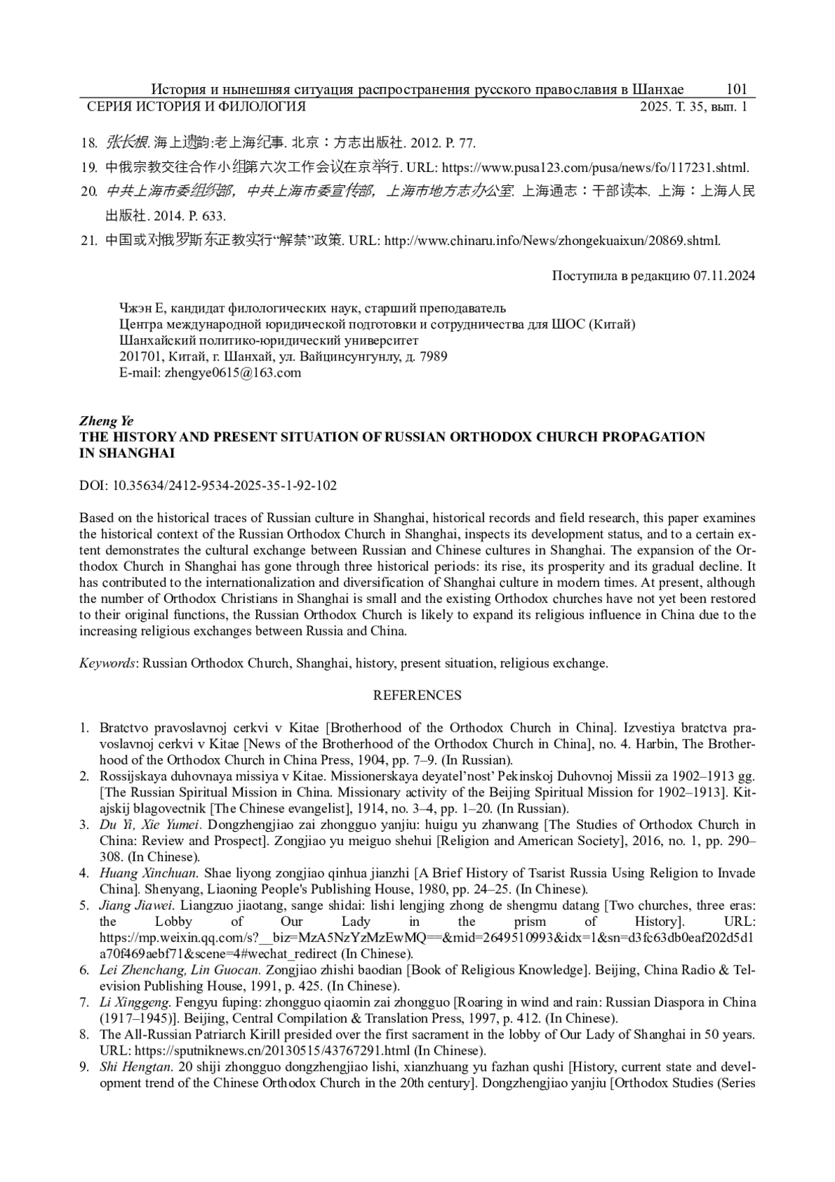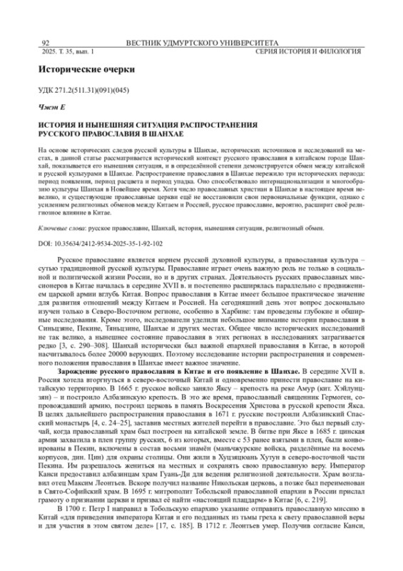 На основе исторических следов русской культуры в Шанхае, исторических источников и исследований на местах, в данной статье рассматривается исторический контекст русского православия в китайском городе Шанхай, показывается его нынешняя ситуация, и в определённой степени демонстрируется обмен между китайской и русской культурами в Шанхае. Распространение православия в Шанхае пережило три исторических периода: период появления, период расцвета и период упадка. Оно способствовало интернационализации и многообразию культуры Шанхая в Новейшее время. Хотя число православных христиан в Шанхае в настоящее время невелико, и существующие православные церкви ещё не восстановили свои первоначальные функции, однако с усилением религиозных обменов между Китаем и Россией, русское православие, вероятно, расширит своё религиозное влияние в Китае.