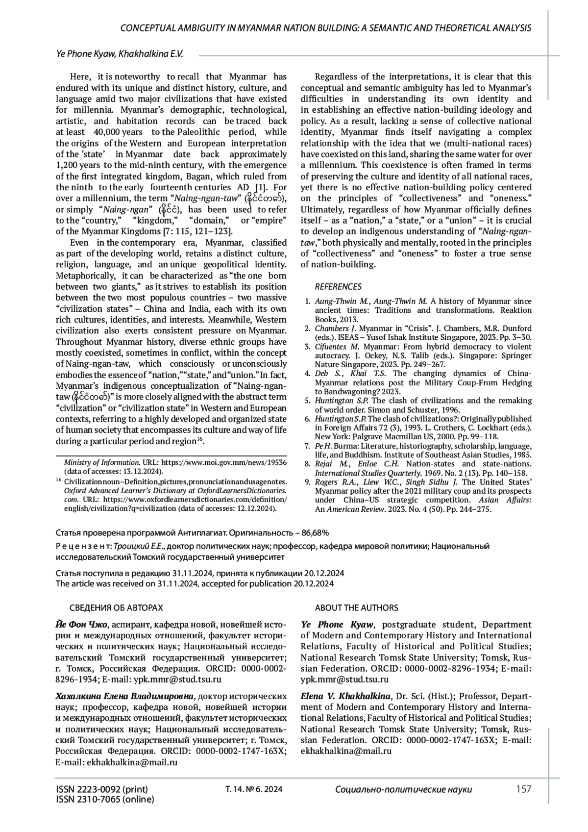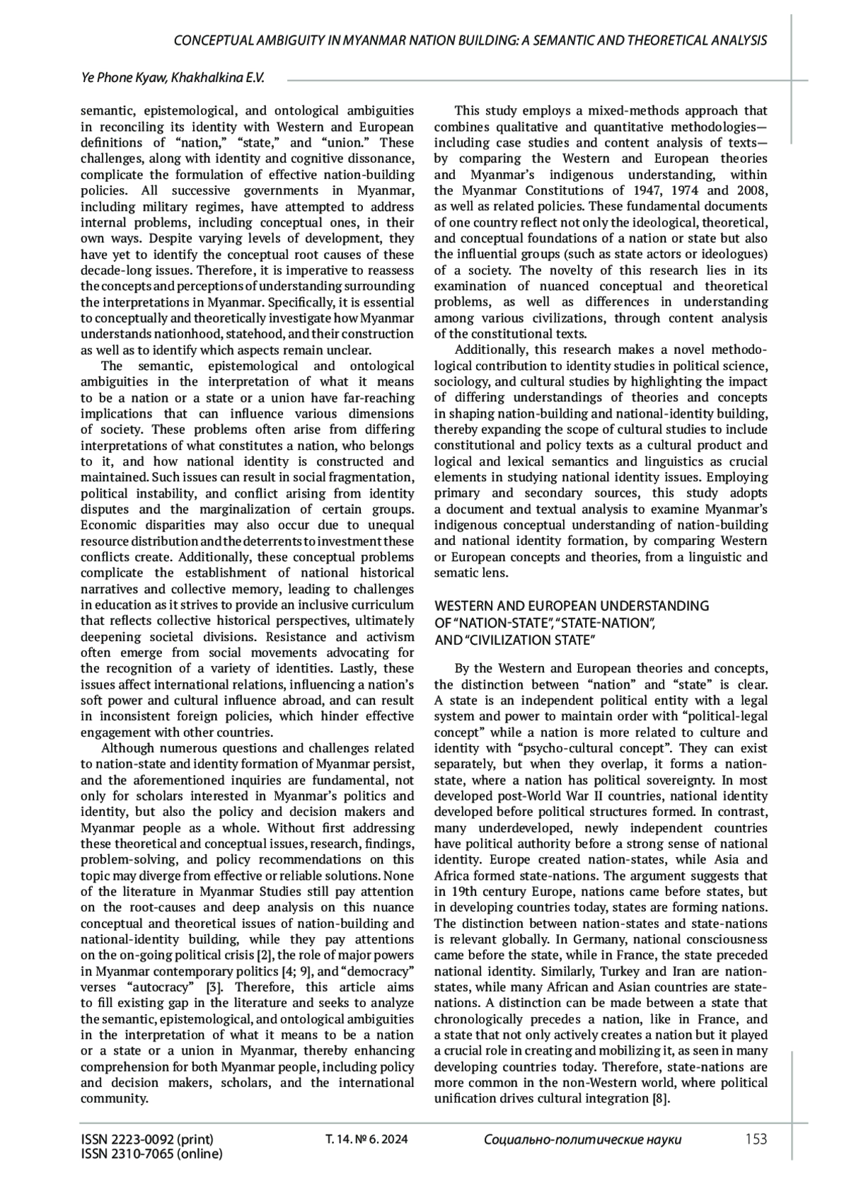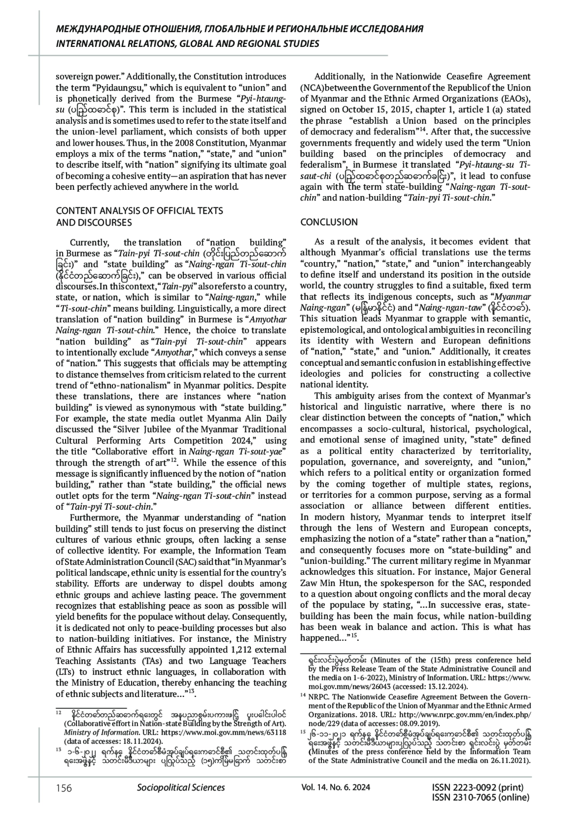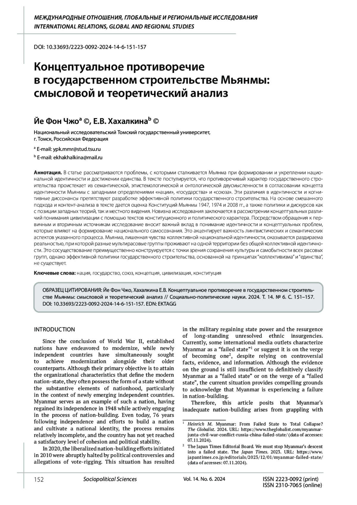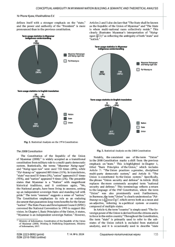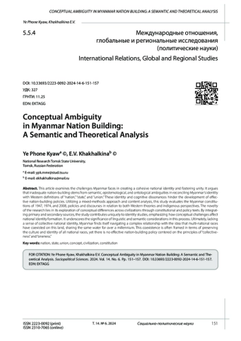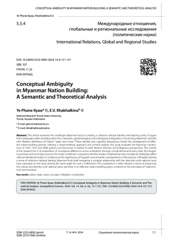 В статье рассматриваются проблемы, с которыми сталкивается Мьянма при формировании и укреплении национальной идентичности и достижении единства. В тексте постулируется, что противоречивый характер государственного строительства проистекает из семантической, эпистемологической и онтологической двусмысленности в согласовании концепта идентичности Мьянмы с западными определениями «нации», «государства» и «союза». Эти различия в идентичности и когнитивные диссонансы препятствуют разработке эффективной политики государственного строительства. На основе смешанного подхода и контент-анализа в тексте дается оценка Конституций Мьянмы 1947, 1974 и 2008 гг., а также политики и дискурсов как с позиции западных теорий, так и местного видения. Новизна исследования заключается в рассмотрении концептуальных различий понимания цивилизации с помощью текстов конституционного и политического характера. Посредством обращения к первичным и вторичным источникам исследование вносит важный вклад в понимание идентичности и концептуальных проблем, которые влияют на формирование национального самосознания. Это акцентирует важность лингвистических и семантических аспектов указанного процесса. Мьянма, лишенная чувства коллективной национальной идентичности, оказывается раздираема реальностью, при которой разные мультирасовые группы проживают на одной территории без общей коллективной идентичности. Это сосуществование преимущественно конструируется с точки зрения сохранения культуры и самобытности всех расовых групп, однако эффективной политики государственного строительства, основанной на принципах “коллективизма” и “единства”, не существует.
