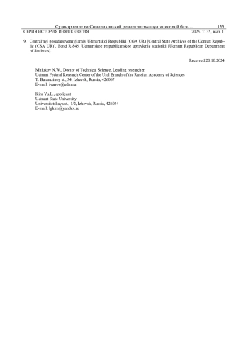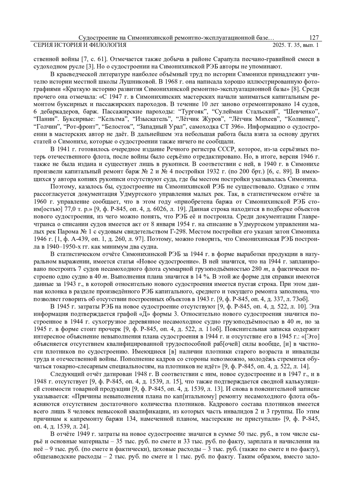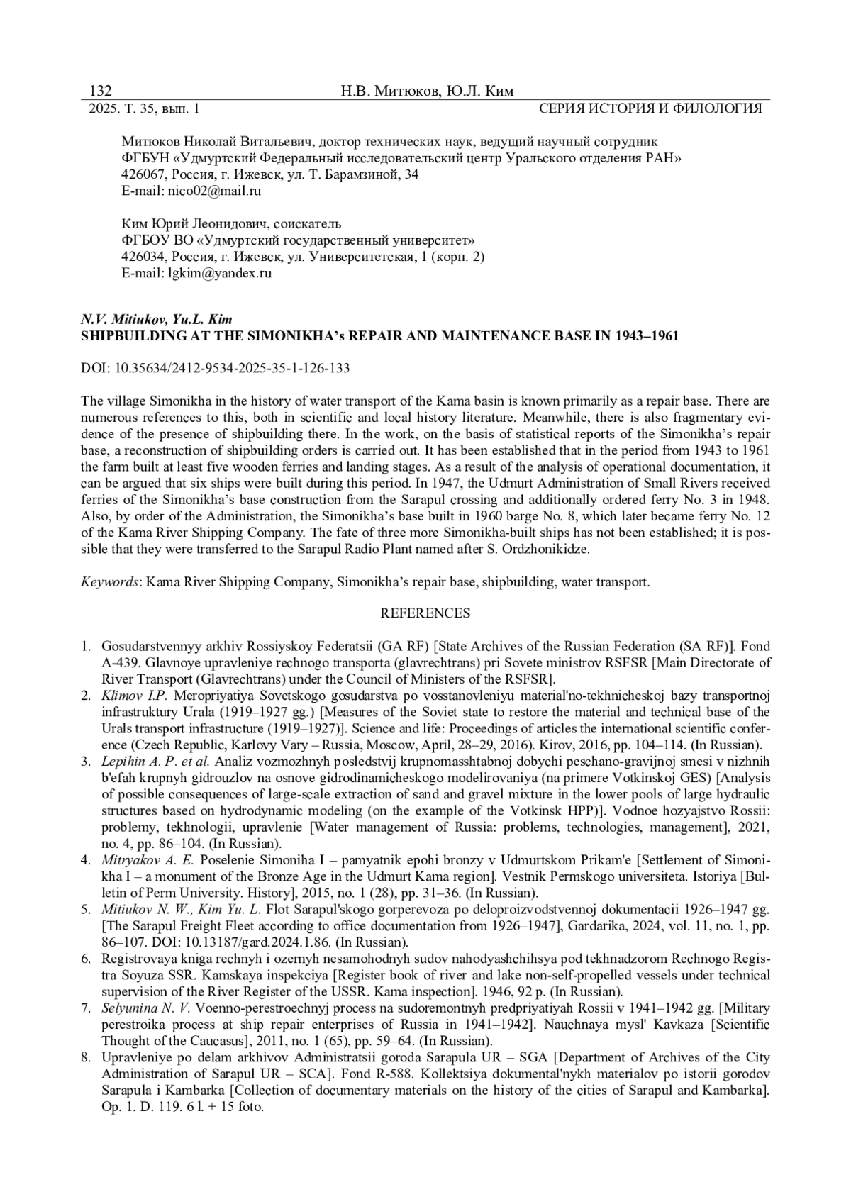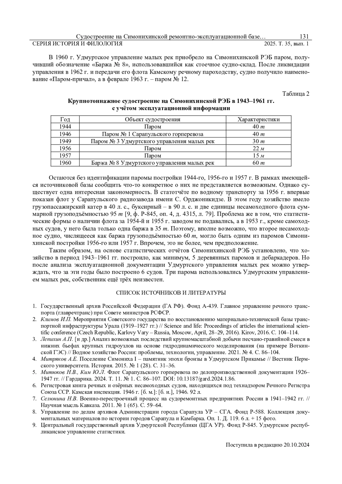 5. 	Митюков Н.В., Ким Ю.Л. Флот Сарапульского горперевоза по делопроизводственной документации 1926-1947 гг. // Гардарика. 2024. Т. 11. № 1. С. 86-107. DOI: 10.13187/gard.2024.1.86 EDN: WGRBLF