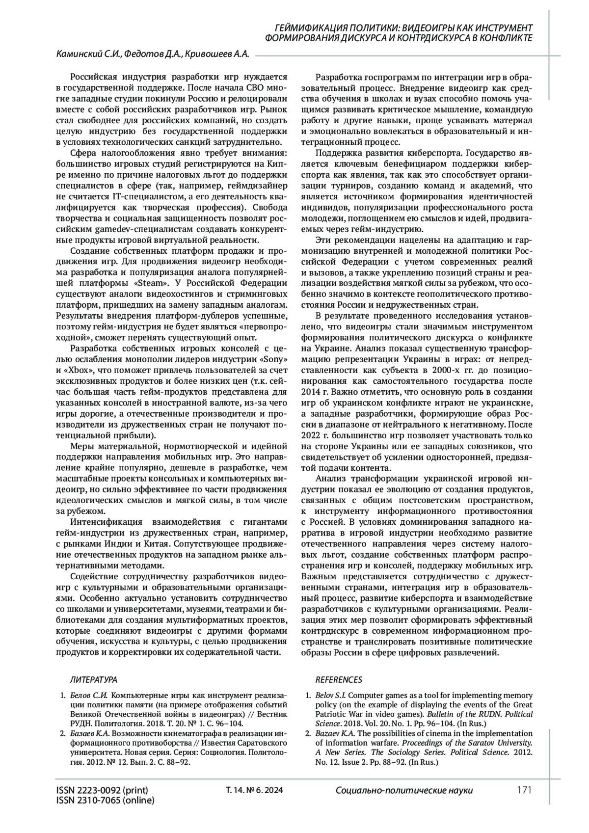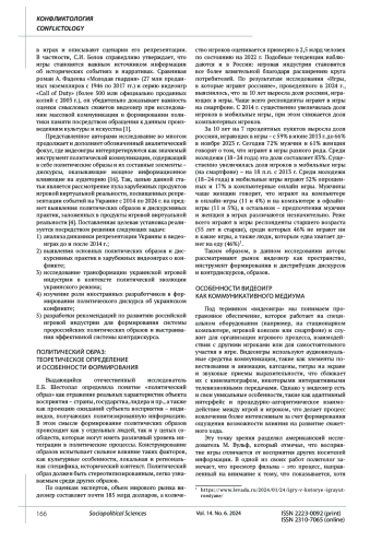 13. Belyaev D.A., Kutomanov S.A., Reznik S.V. Propaganda strategies in video games: practices and current topics. Nomothetika: Philosophy. Sociology. Right. 2021. Vol. 46. No. 3. Pp. 443-450. DOI: 10.52575/2712-746X-2021-46-3-443-450 EDN: SEWALF