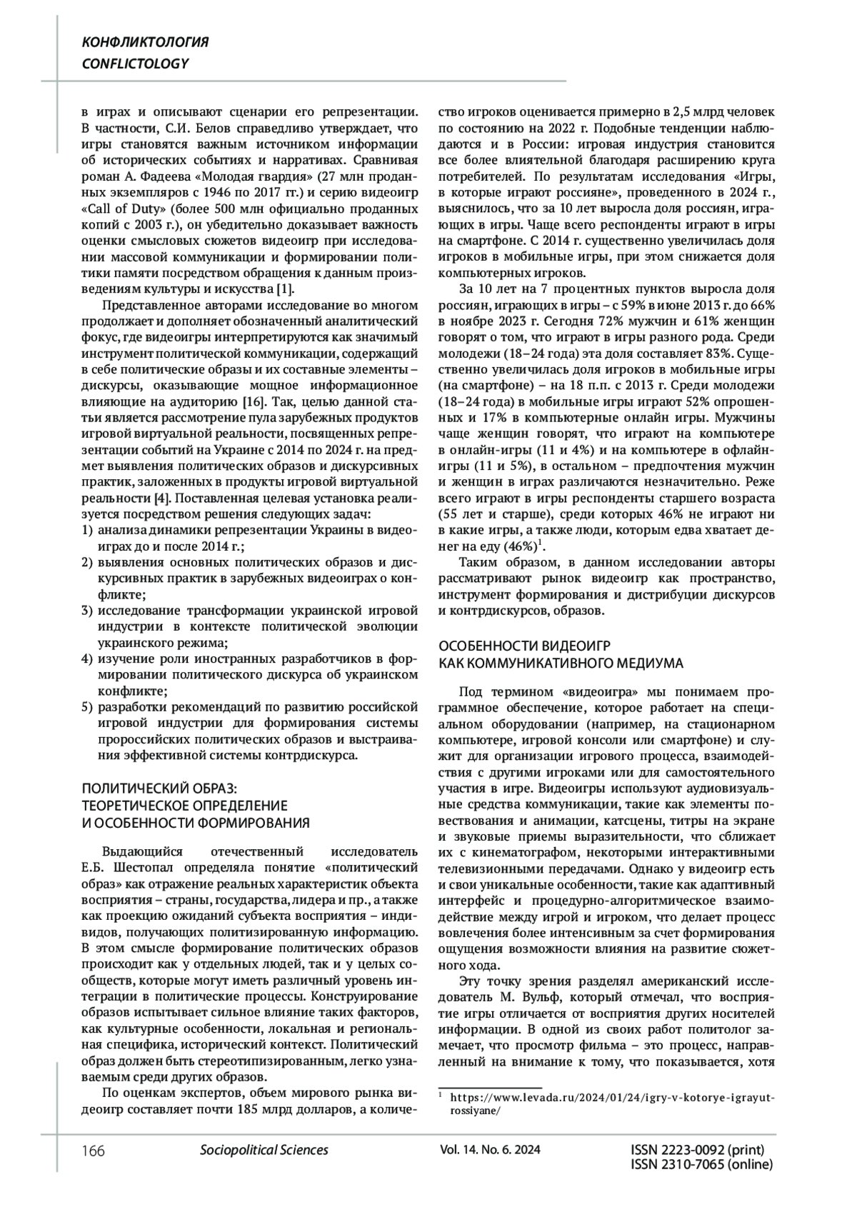 Цель исследования - рассмотрение пула зарубежных продуктов игровой виртуальной реальности, посвященных репрезентации событий на Украине с 2014 по 2024 г. на предмет выявления политических образов и дискурсивных практик, заложенных в продукты игровой виртуальной реальности. В ходе работы установлено, что видеоигры стали значимым инструментом формирования политического дискурса и конструирования политических образов, при этом выявлена существенная трансформация репрезентации Украины: от непредставленности как субъекта в 2000-х гг. до позиционирования как самостоятельного государства после 2014 г. На фоне того, что мировой рынок видеоигр составляет около 185 млрд долларов с аудиторией 2,5 млрд человек, а 66% россиян играют в видеоигры, особенно важно отметить, что большинство игр создается не украинскими, а зарубежными разработчиками, при этом образ России эволюционировал от нейтрального к негативному, а после 2022 г. большинство игр позволяет участвовать только на стороне Украины или ее западных союзников. На основе проведенного исследования предложены рекомендации по развитию отечественной игровой индустрии, включающие налоговые льготы, создание собственных платформ распространения игр, разработку игровых консолей и поддержку мобильных игр, что необходимо для формирования эффективного контрдискурса в современном информационном пространстве.