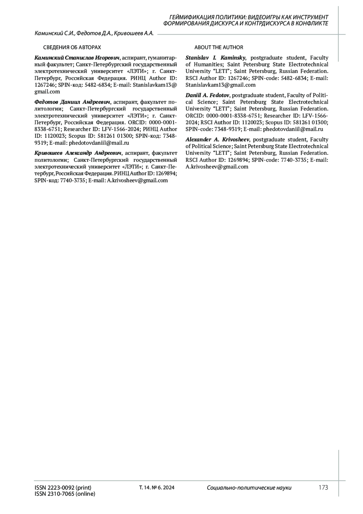 Maltseva D.A., Fedotov D.A. Transformation of communications among Russian youth of generation Z and under the influence of intensive introduction of gaming technologies. In: Political science in a changing world: New practices and theoretical search. Materials of the All-Russian RAPN Conference with international participation. Moscow, 2023. Pp. 347-348.