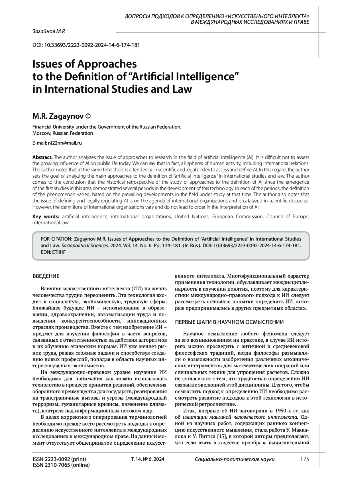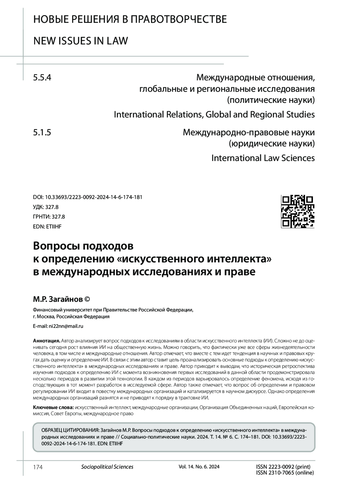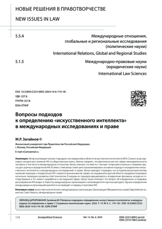 Автор анализирует вопрос подходов к исследованиям в области искусственного интеллекта (ИИ). Сложно не до оценивать сегодня рост влияния ИИ на общественную жизнь. Можно говорить, что фактически уже все сферы жизнедеятельности человека, в том числе и международные отношения. Автор отмечает, что вместе с тем идет тенденция в научных и правовых кругах дать оценку и определение ИИ. В связи с этим автор ставит цель проанализировать основные подходы к определению «искусственного интеллекта» в международных исследованиях и праве. Автор приходит к выводам, что историческая ретроспектива изучения подходов к определению ИИ с момента возникновения первых исследований в данной области продемонстрировала несколько периодов в развитии этой технологии. В каждом из периодов варьировалось определение феномена, исходя из господствующих в тот момент разработок в исследуемой сфере. Автор также отмечает, что вопрос об определении и правовом регулировании ИИ входит в повестку международных организаций и катализируется в научном дискурсе. Однако определения международных организаций разнятся и не приводят к порядку в трактовке ИИ.
