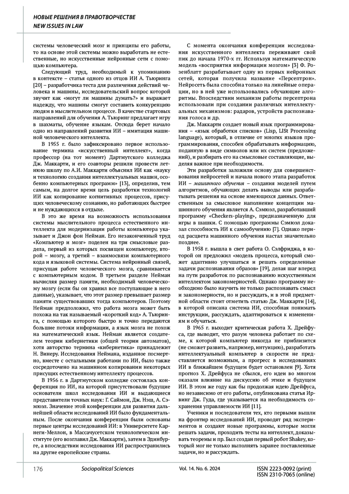1. 	Бахтеев Д.В. Предпосылки становления и этапы развития технологии искусственного интеллекта // Genesis: исторические исследования. 2019. № 8. С. 89-98. EDN: IGNSQQ