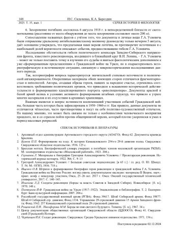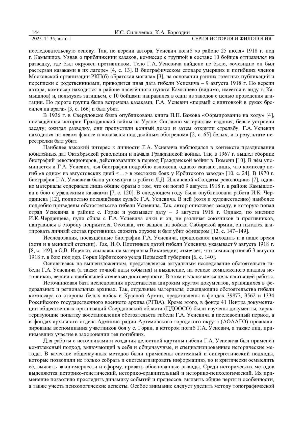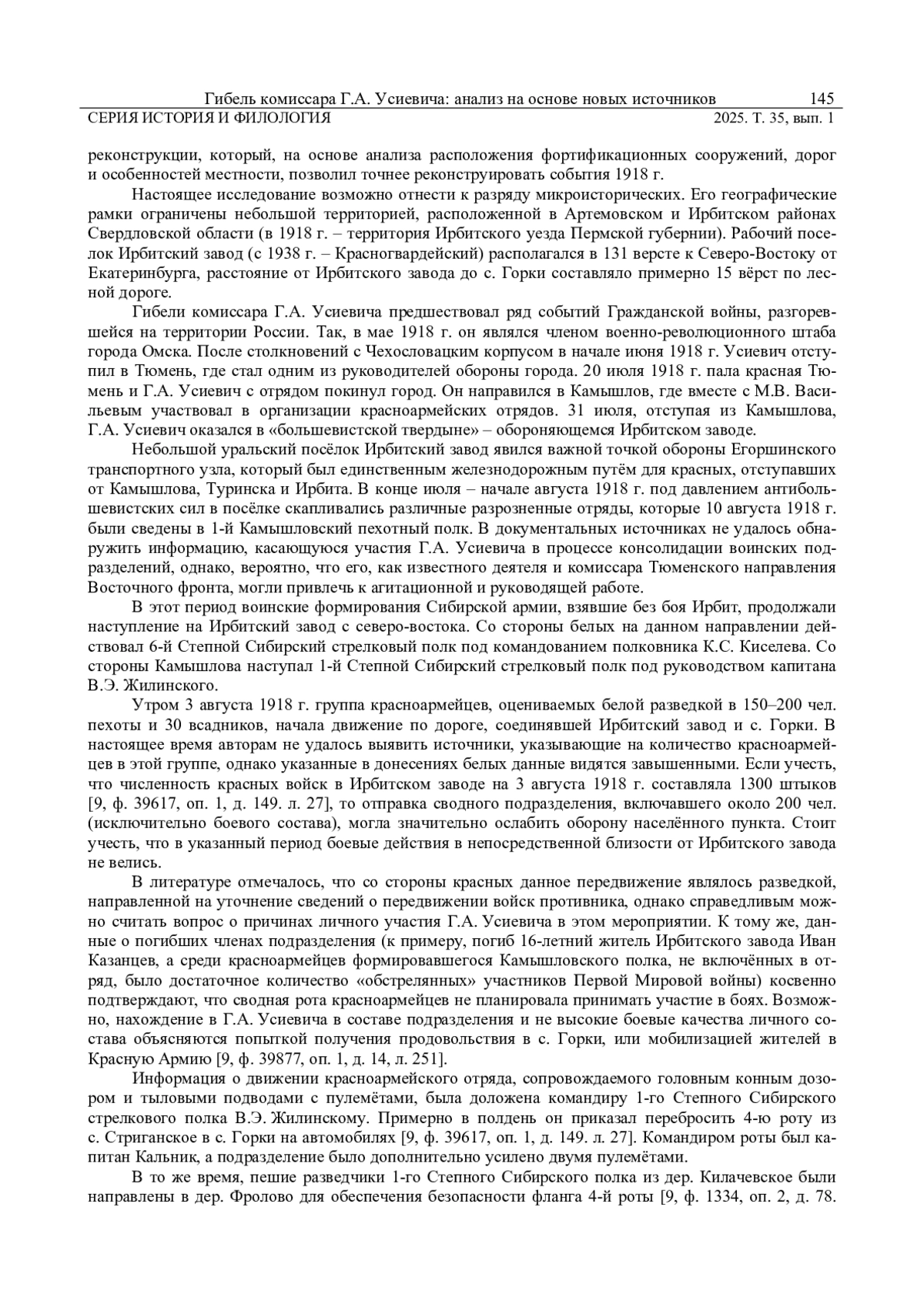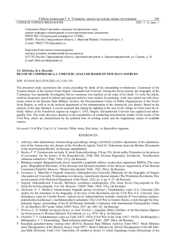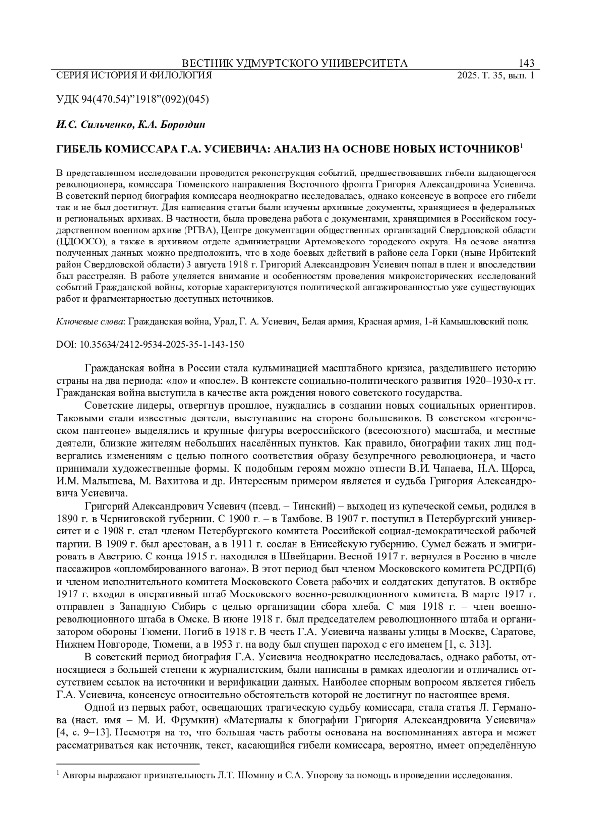 В представленном исследовании проводится реконструкция событий, предшествовавших гибели выдающегося революционера, комиссара Тюменского направления Восточного фронта Григория Александровича Усиевича. В советский период биография комиссара неоднократно исследовалась, однако консенсус в вопросе его гибели так и не был достигнут. Для написания статьи были изучены архивные документы, хранящиеся в федеральных и региональных архивах. В частности, была проведена работа с документами, хранящимися в Российском государственном военном архиве (РГВА), Центре документации общественных организаций Свердловской области (ЦДООСО), а также в архивном отделе администрации Артемовского городского округа. На основе анализа полученных данных можно предположить, что в ходе боевых действий в районе села Горки (ныне Ирбитский район Свердловской области) 3 августа 1918 г. Григорий Александрович Усиевич попал в плен и впоследствии был расстрелян. В работе уделяется внимание и особенностям проведения микроисторических исследований событий Гражданской войны, которые характеризуются политической ангажированностью уже существующих работ и фрагментарностью доступных источников