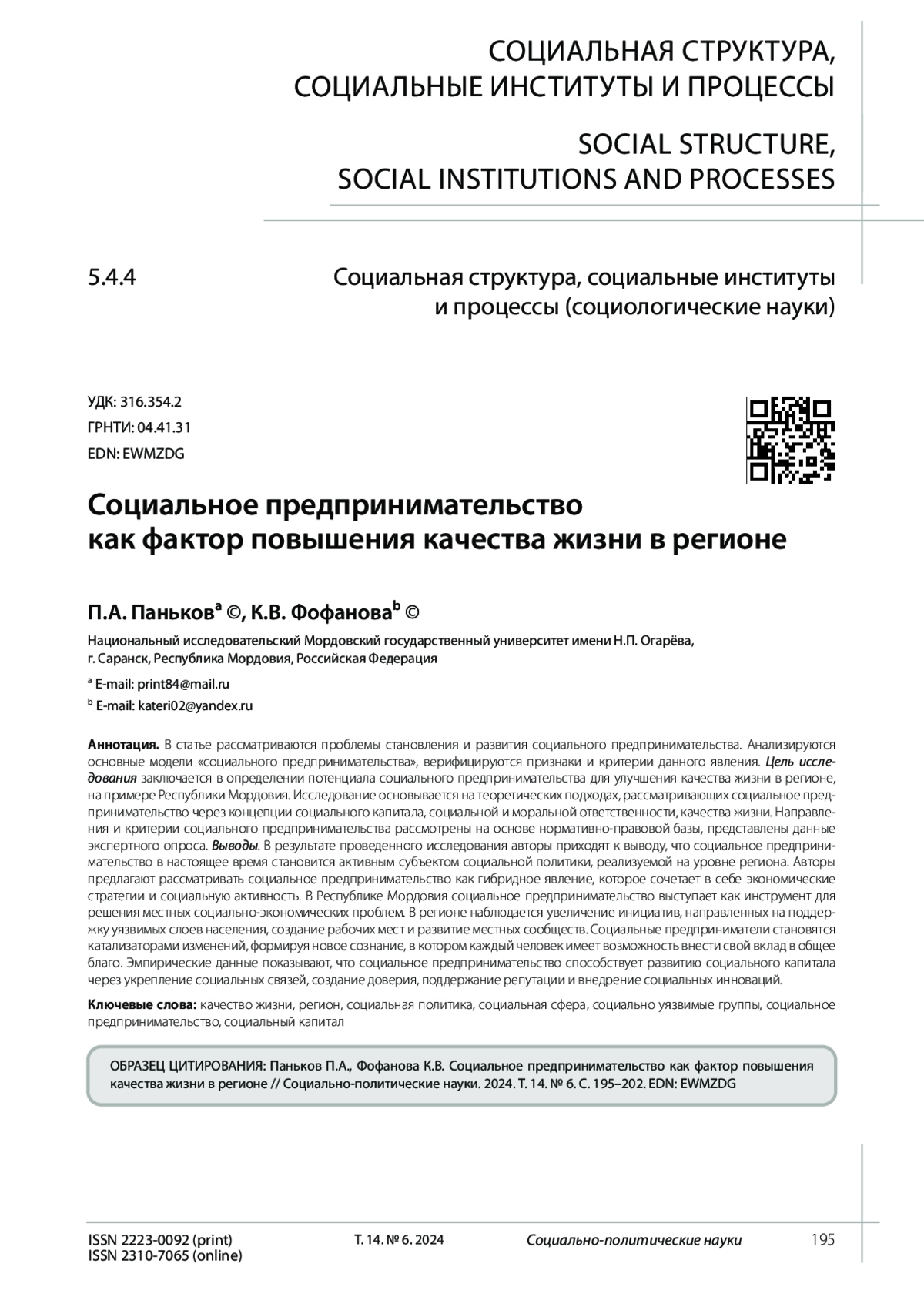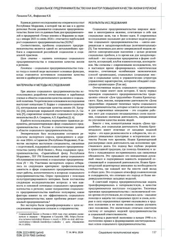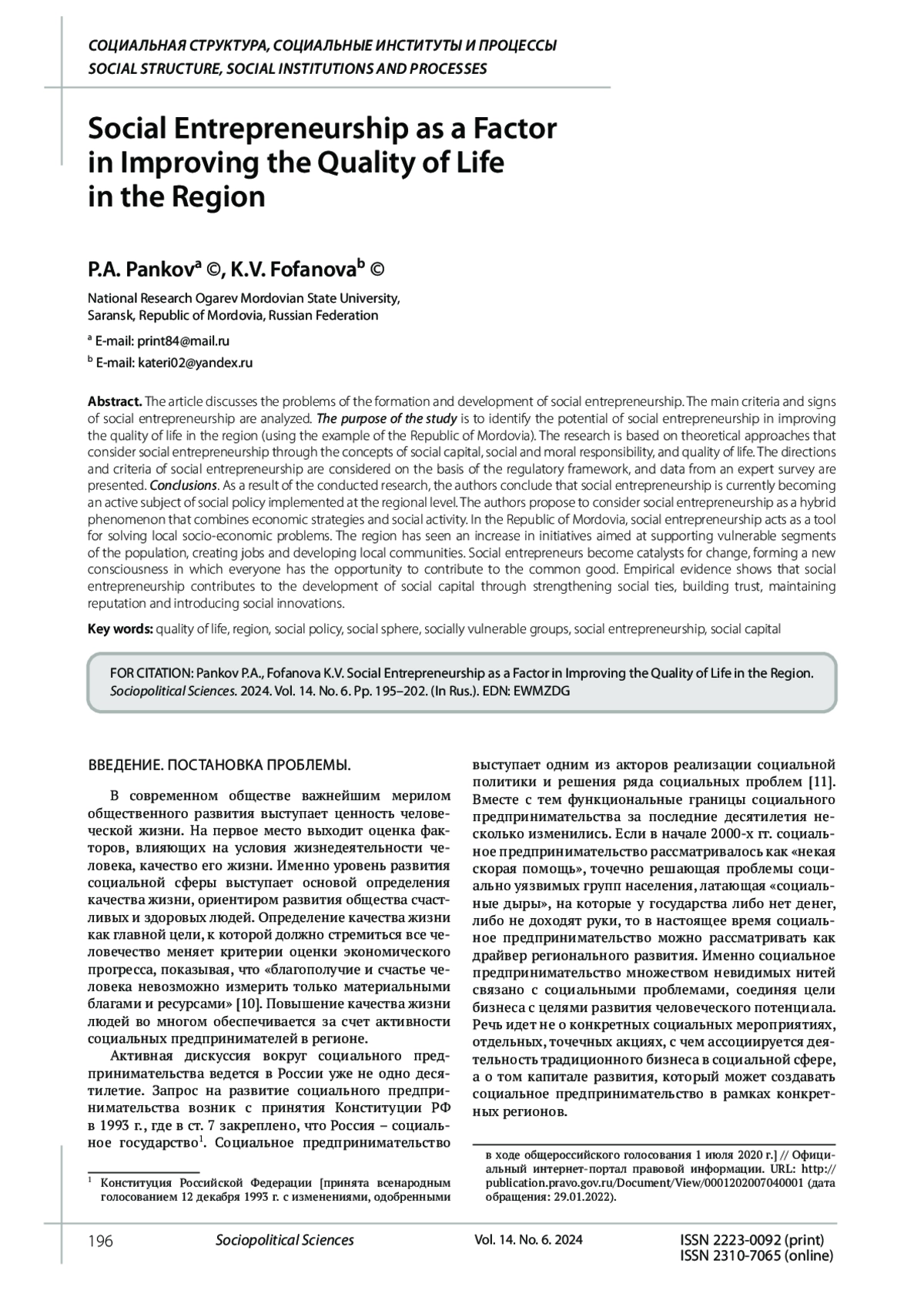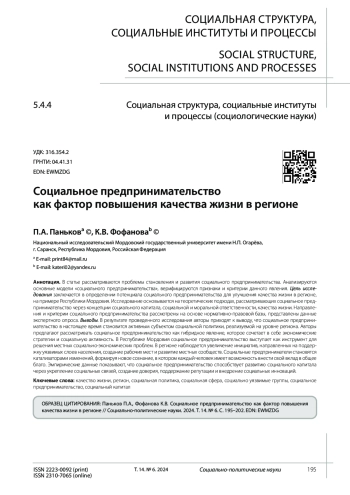 В статье рассматриваются проблемы становления и развития социального предпринимательства. Анализируются основные модели «социального предпринимательства», верифицируются признаки и критерии данного явления. Цель исследования заключается в определении потенциала социального предпринимательства для улучшения качества жизни в регионе, на примере Республики Мордовия. Исследование основывается на теоретических подходах, рассматривающих социальное предпринимательство через концепции социального капитала, социальной и моральной ответственности, качества жизни. Направления и критерии социального предпринимательства рассмотрены на основе нормативно-правовой базы, представлены данные экспертного опроса. Выводы. В результате проведенного исследования авторы приходят к выводу, что социальное предпринимательство в настоящее время становится активным субъектом социальной политики, реализуемой на уровне региона. Авторы предлагают рассматривать социальное предпринимательство как гибридное явление, которое сочетает в себе экономические стратегии и социальную активность. В Республике Мордовия социальное предпринимательство выступает как инструмент для решения местных социально-экономических проблем. В регионе наблюдается увеличение инициатив, направленных на поддержку уязвимых слоев населения, создание рабочих мест и развитие местных сообществ. Социальные предприниматели становятся катализаторами изменений, формируя новое сознание, в котором каждый человек имеет возможность внести свой вклад в общее благо. Эмпирические данные показывают, что социальное предпринимательство способствует развитию социального капитала через укрепление социальных связей, создание доверия, поддержание репутации и внедрение социальных инноваций.