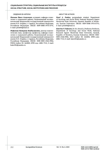 Solovyova T.V., Bistyakina D.A., Pankova E.G. The possibilities of social work to improve the quality of life of the elderly and veterans in the Republic of Mordovia. In: The social potential of the elderly: Conditions, experience, problems of effective application. Materials of the Interregional Scientific and Practical Conference (Saransk, November 15, 2018). L.I. Savinov (gen. ed.). Saransk: Individual entrepreneur Vyacheslav S. Afanasyev, 2019. Pp. 157-160.