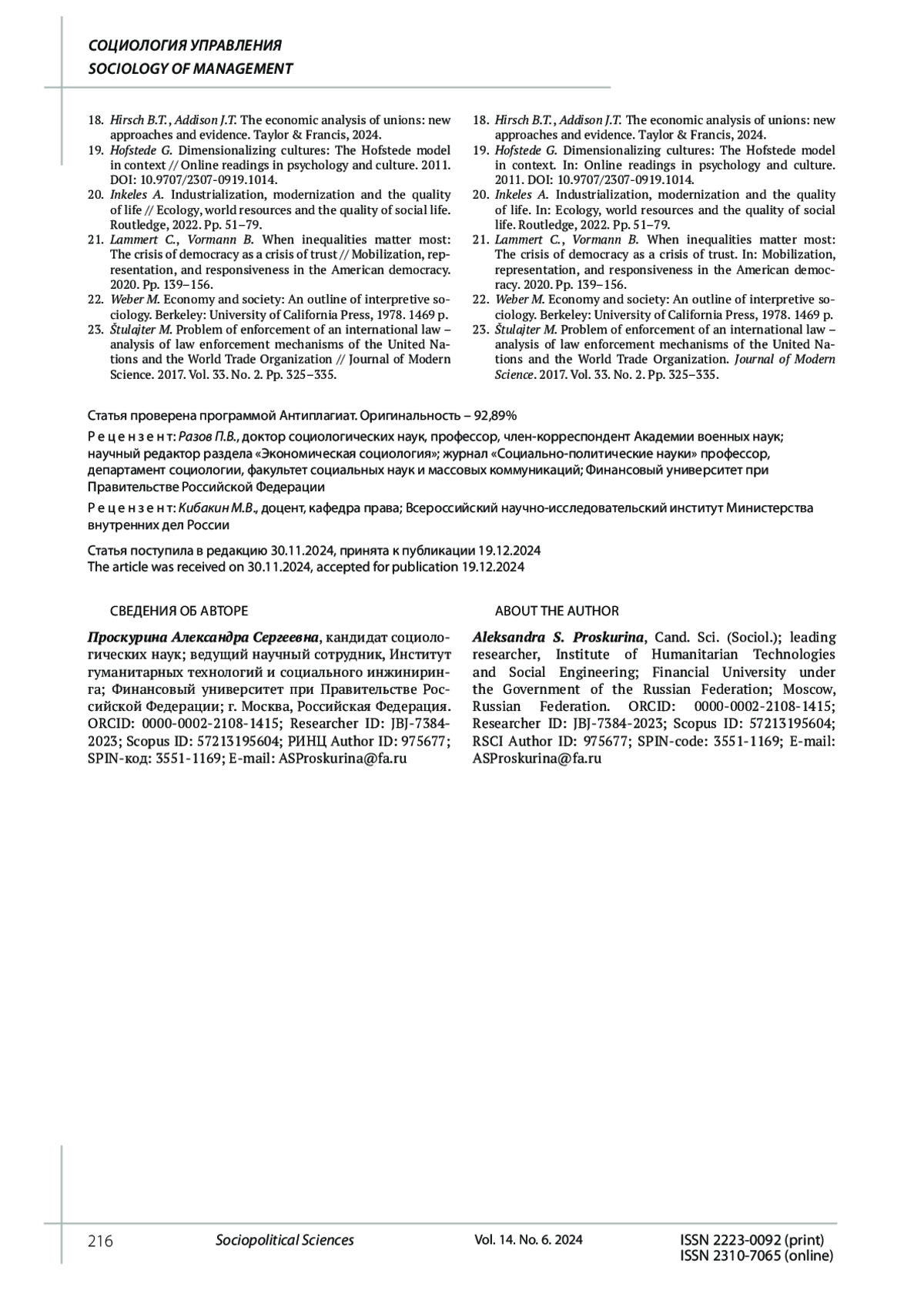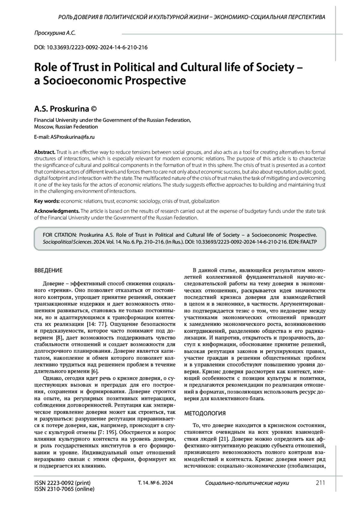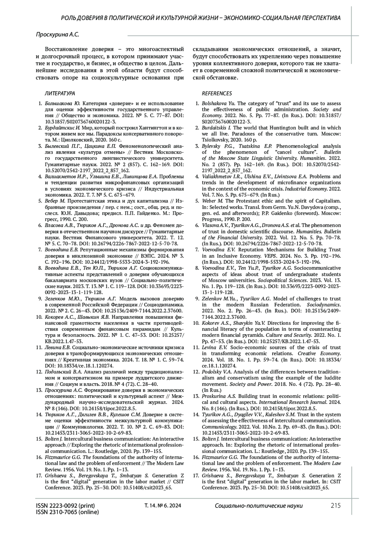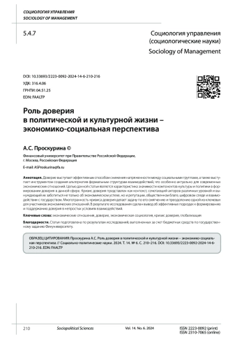 13. 	Проскурина А.С. Формирование доверия в экономических отношениях: политический и культурный аспект // Международный научно-исследовательский журнал. 2024. № 8 (146). DOI: 10.24158/tipor.2022.8.5 EDN: MRIZIN