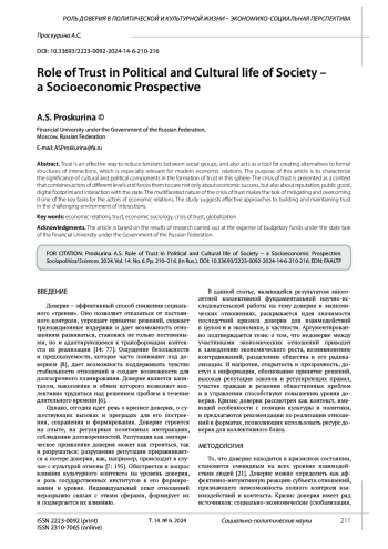Proskurina A.S. Building trust in economic relations: political and cultural aspects. International Research Journal. 2024. No. 8 (146). (In Rus.). DOI: 10.24158/tipor.2022.8.5 EDN: JJAUGU