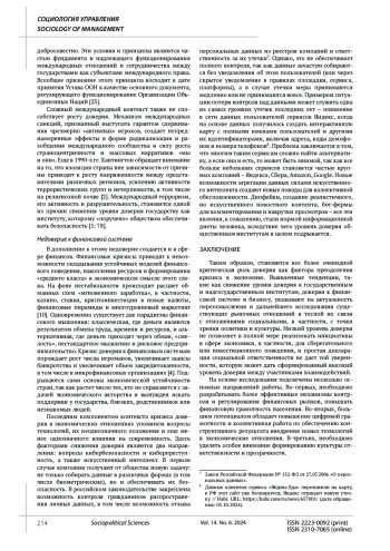 1. 	Большакова Ю. Категория “доверие” и ее использование для оценки эффективности государственного управления // Общество и экономика. 2022. № 5. С. 77-87. DOI: 10.31857/S020736760020122-3 EDN: RPCZUC