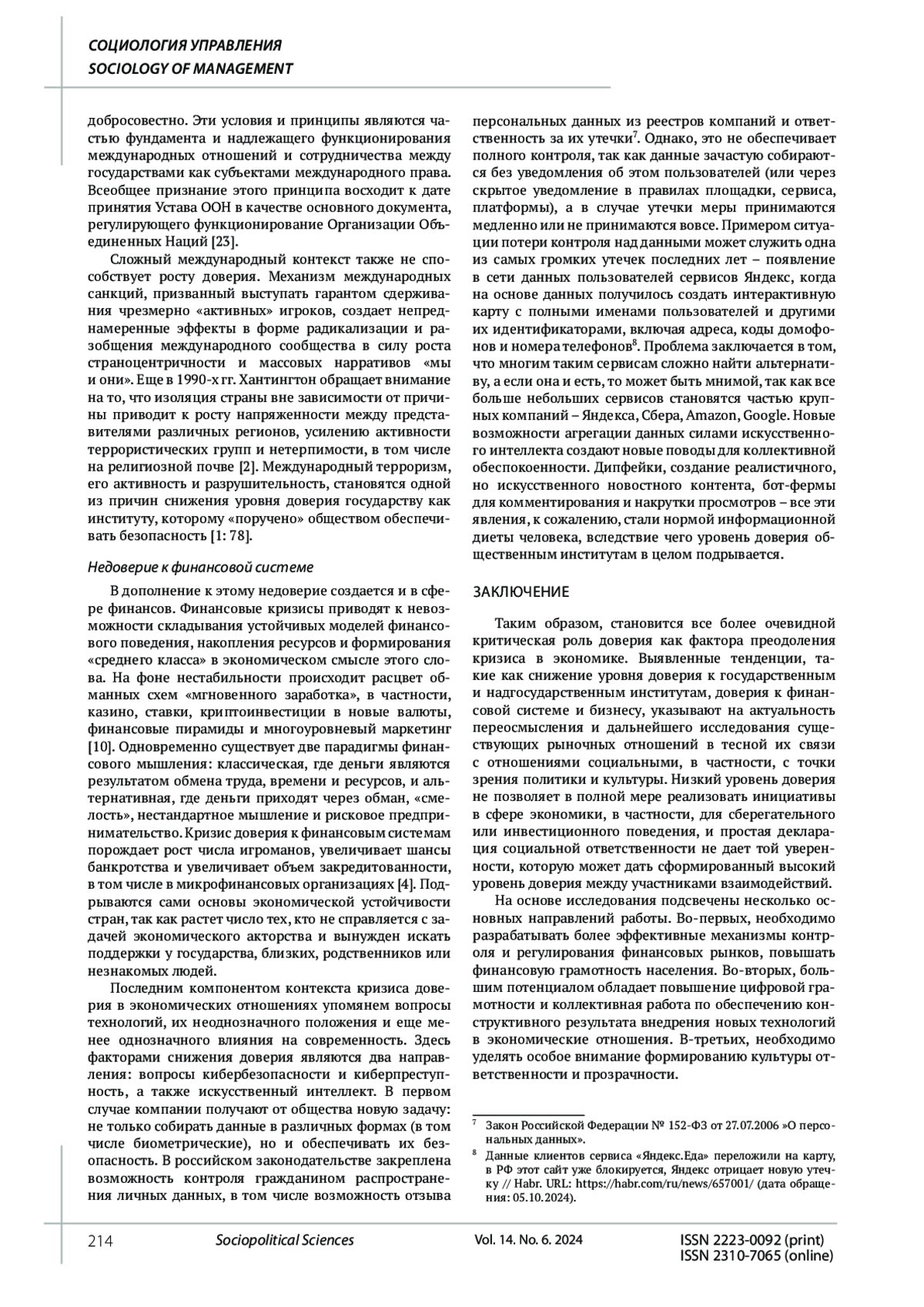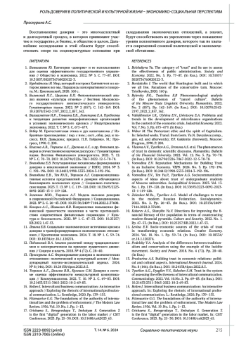 9. 	Зеленков М.Ю., Тюриков А.Г. Модель вызовов доверию в современной Российской Федерации // Социодинамика. 2022. № 2. С. 26-43. DOI: 10.25136/2409-7144.2022.2.37600 EDN: DMUHVF