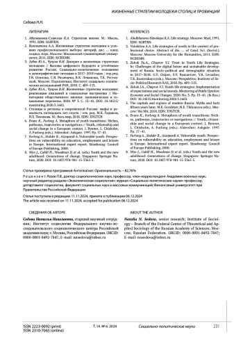 2. 	Волокитина А.А. Жизненные стратегии молодежи в условиях профессионального выбора: автореф. дис.... канд. социол. наук. Moscow: Московский гуманитарный университет, 2011. EDN: NCBXMN