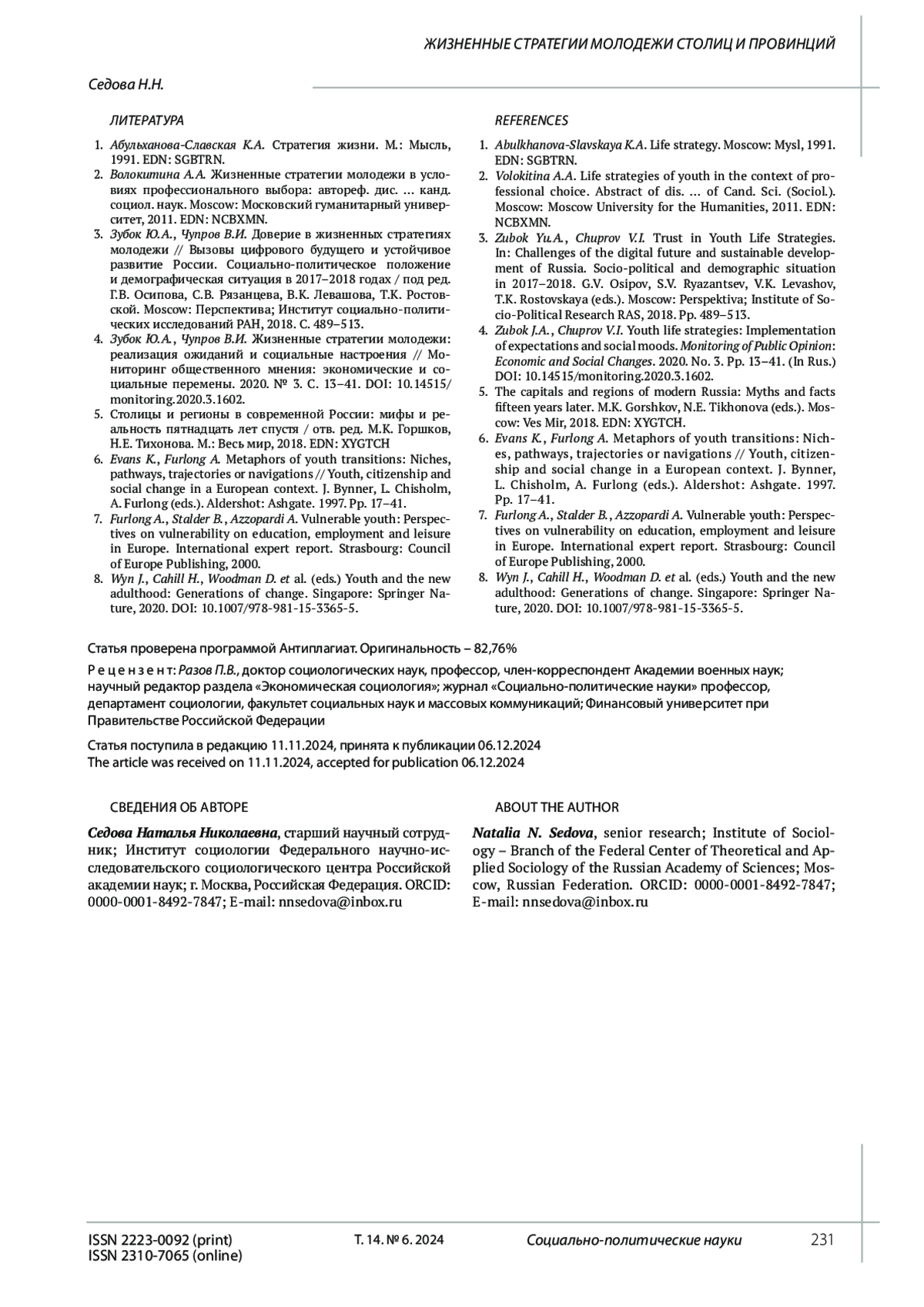 4. 	Зубок Ю.А., Чупров В.И. Жизненные стратегии молодежи: реализация ожиданий и социальные настроения // Мониторинг общественного мнения: экономические и социальные перемены. 2020. № 3. С. 13-41. DOI: 10.14515/monitoring.2020.3.1602 EDN: GTXODD