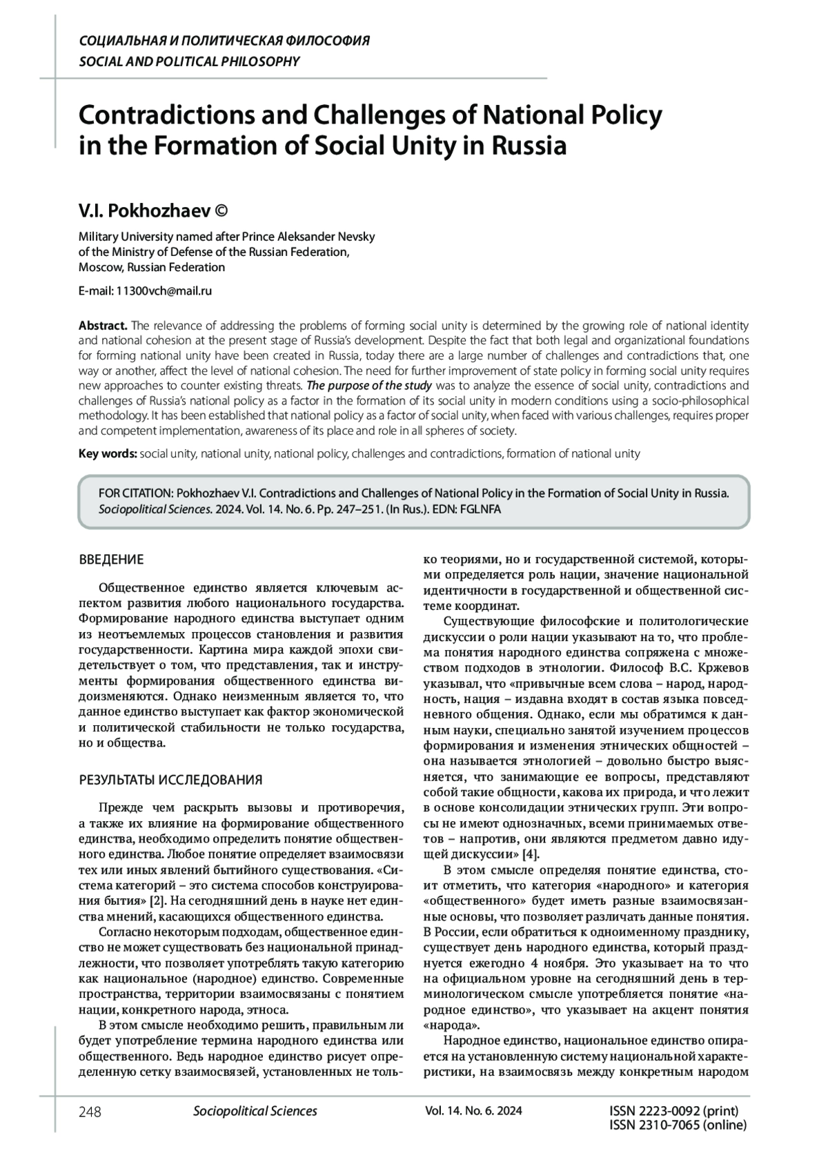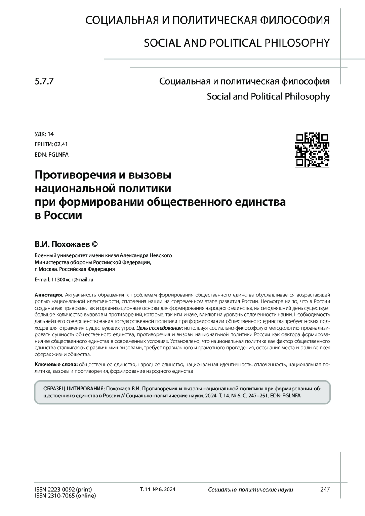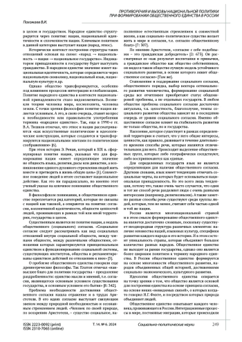 Актуальность обращения к проблемам формирования общественного единства обуславливается возрастающей ролью национальной идентичности, сплочения нации на современном этапе развития России. Несмотря на то, что в России созданы как правовые, так и организационные основы для формирования народного единства, на сегодняшний день существует большое количество вызовов и противоречий, которые, так или иначе, влияют на уровень сплоченности нации. Необходимость дальнейшего совершенствования государственной политики при формировании общественного единства требует новых подходов для отражения существующих угроз. Цель исследования: используя социально-философскую методологию проанализировать сущность общественного единства, противоречия и вызовы национальной политики России как фактора формирования ее общественного единства в современных условиях. Установлено, что национальная политика как фактор общественного единства сталкиваясь с различными вызовами, требует правильного и грамотного проведения, осознания места и роли во всех сферах жизни общества.