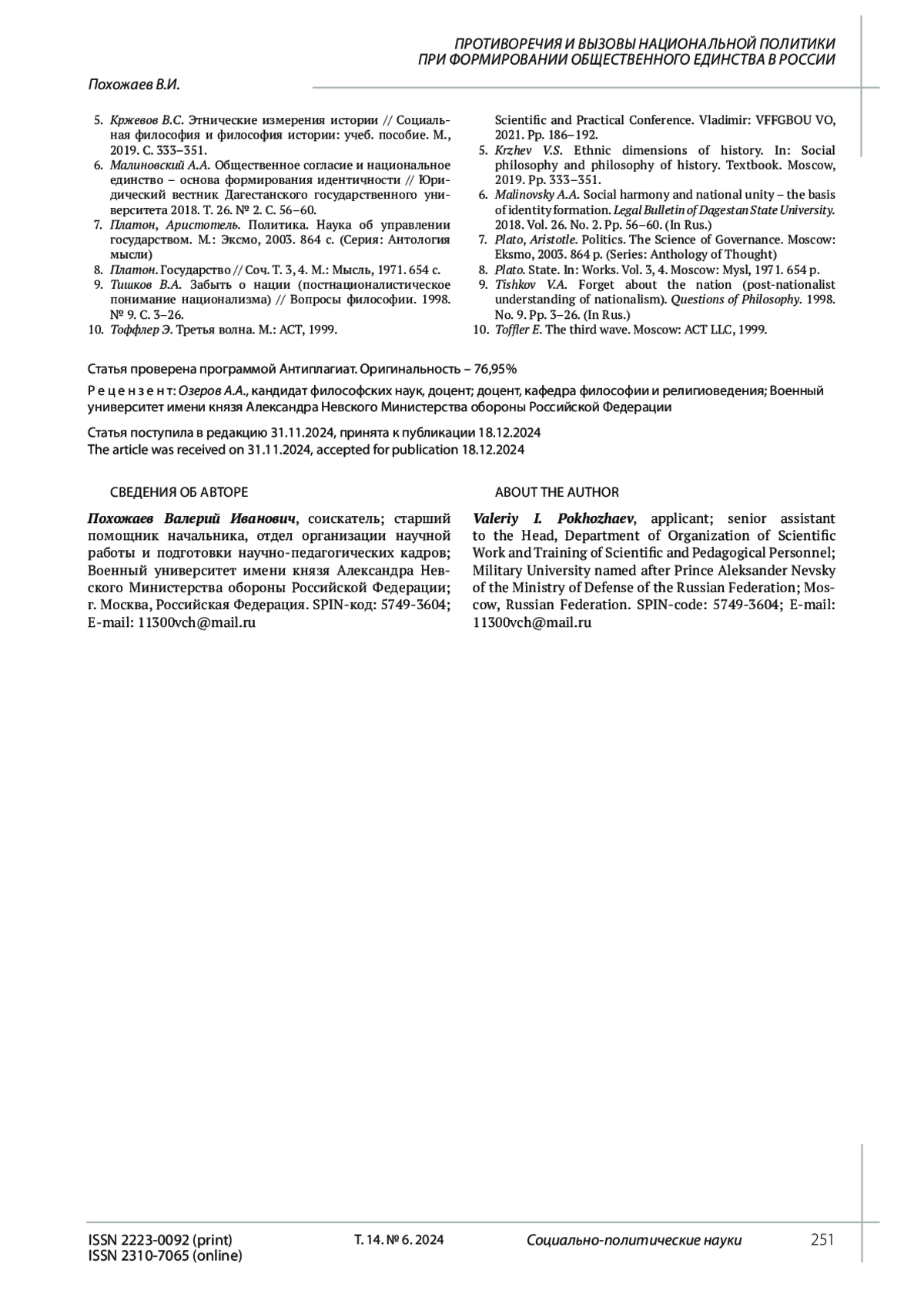 6. 	Малиновский А.А. Общественное согласие и национальное единство - основа формирования идентичности // Юридический вестник Дагестанского государственного университета 2018. Т. 26. № 2. С. 56-60. EDN: XTCWPJ