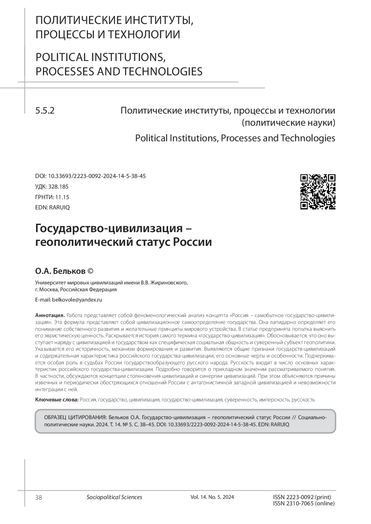Grachev B.V. The civilizational choice of Russia: A Eurasian alternative. Sociodynamics. 2022. No. 8. Pp. 38-52. (In Rus.). EDN: KLGGIM
