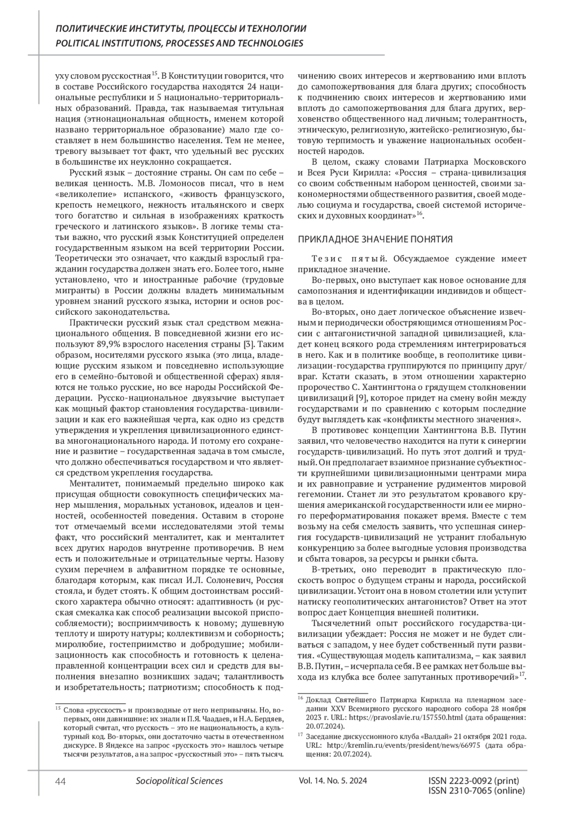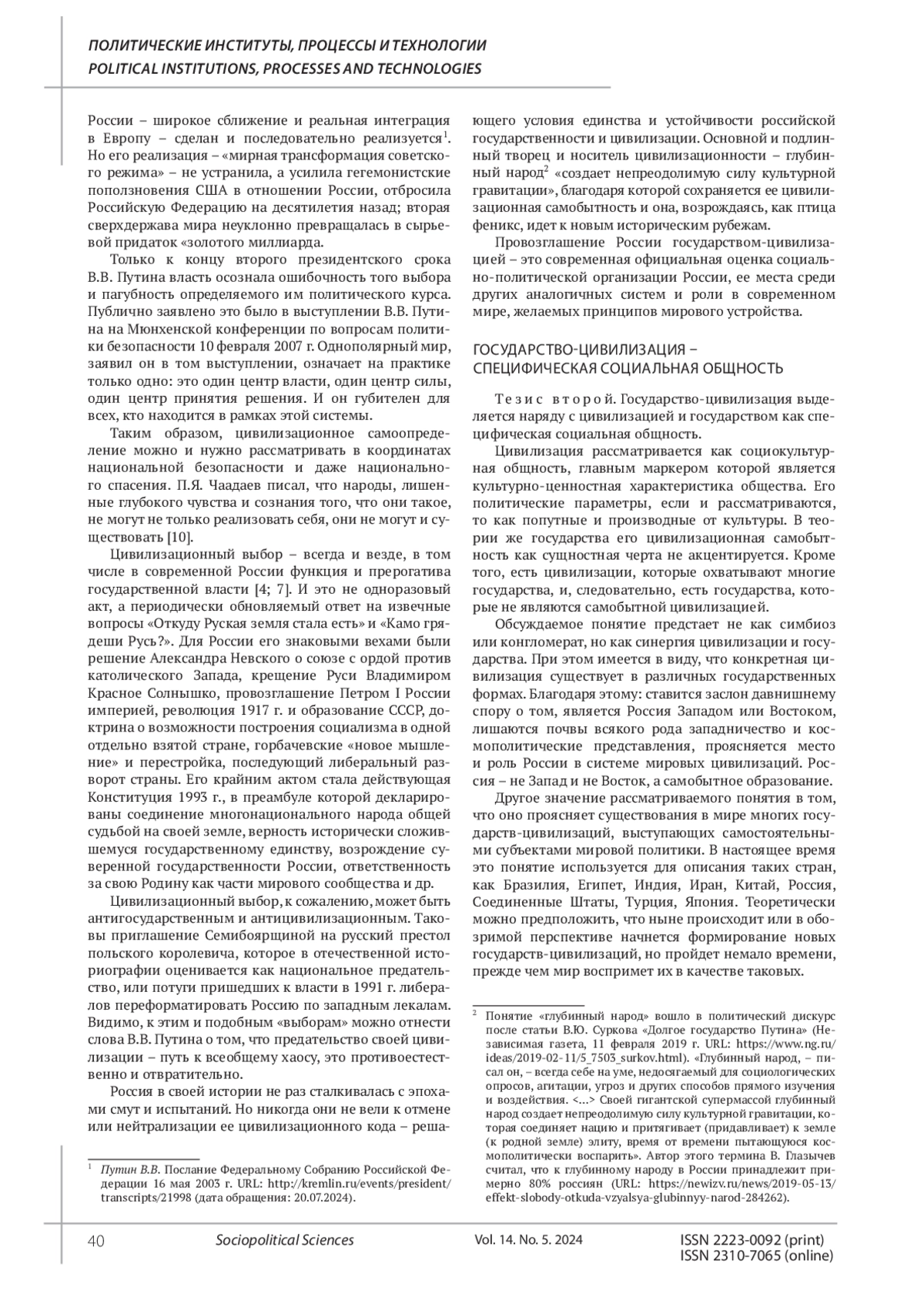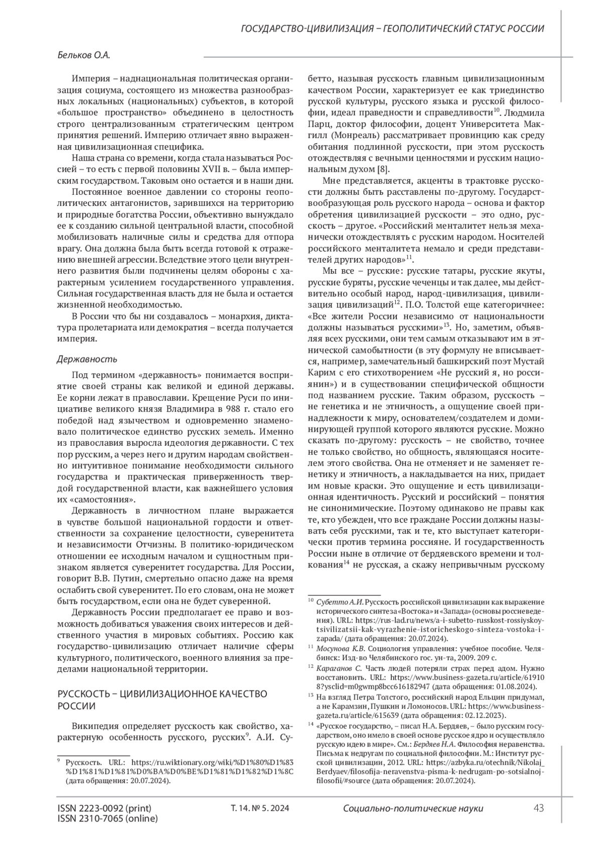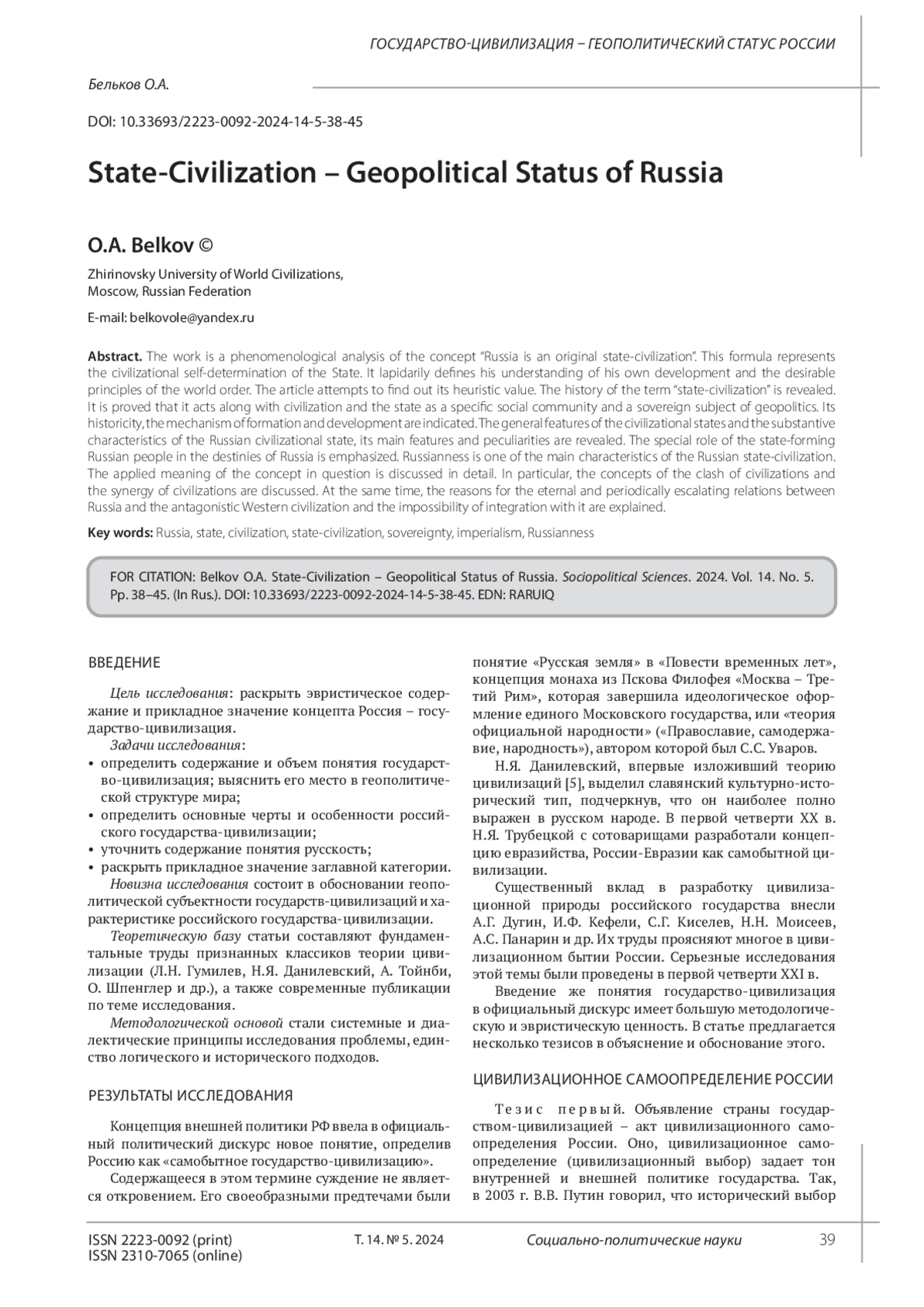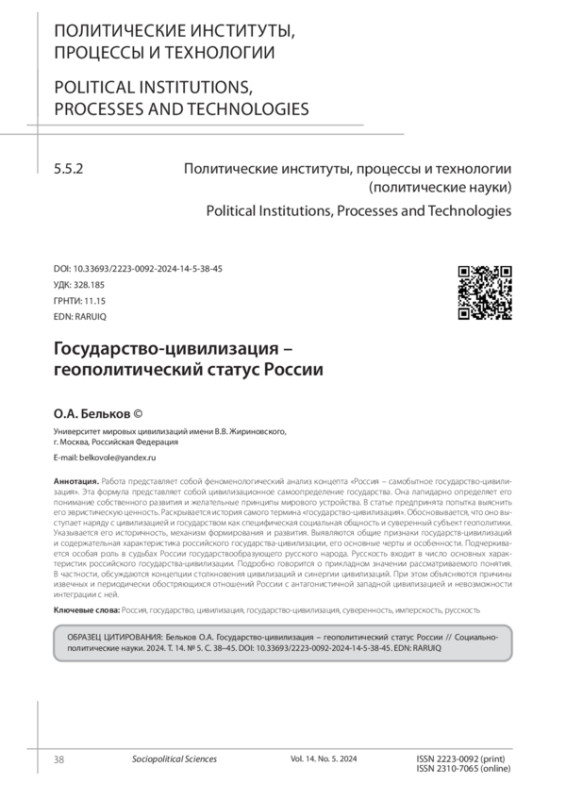 Работа представляет собой феноменологический анализ концепта «Россия - самобытное государство-цивилизация». Эта формула представляет собой цивилизационное самоопределение государства. Она лапидарно определяет его понимание собственного развития и желательные принципы мирового устройства. В статье предпринята попытка выяснить его эвристическую ценность. Раскрывается история самого термина «государство-цивилизация». Обосновывается, что оно выступает наряду с цивилизацией и государством как специфическая социальная общность и суверенный субъект геополитики. Указывается его историчность, механизм формирования и развития. Выявляются общие признаки государств-цивилизаций и содержательная характеристика российского государства-цивилизации, его основные черты и особенности. Подчеркивается особая роль в судьбах России государствообразующего русского народа. Русскость входит в число основных характеристик российского государства-цивилизации. Подробно говорится о прикладном значении рассматриваемого понятия. В частности, обсуждаются концепции столкновения цивилизаций и синергии цивилизаций. При этом объясняются причины извечных и периодически обостряющихся отношений России с антагонистичной западной цивилизацией и невозможности интеграции с ней.