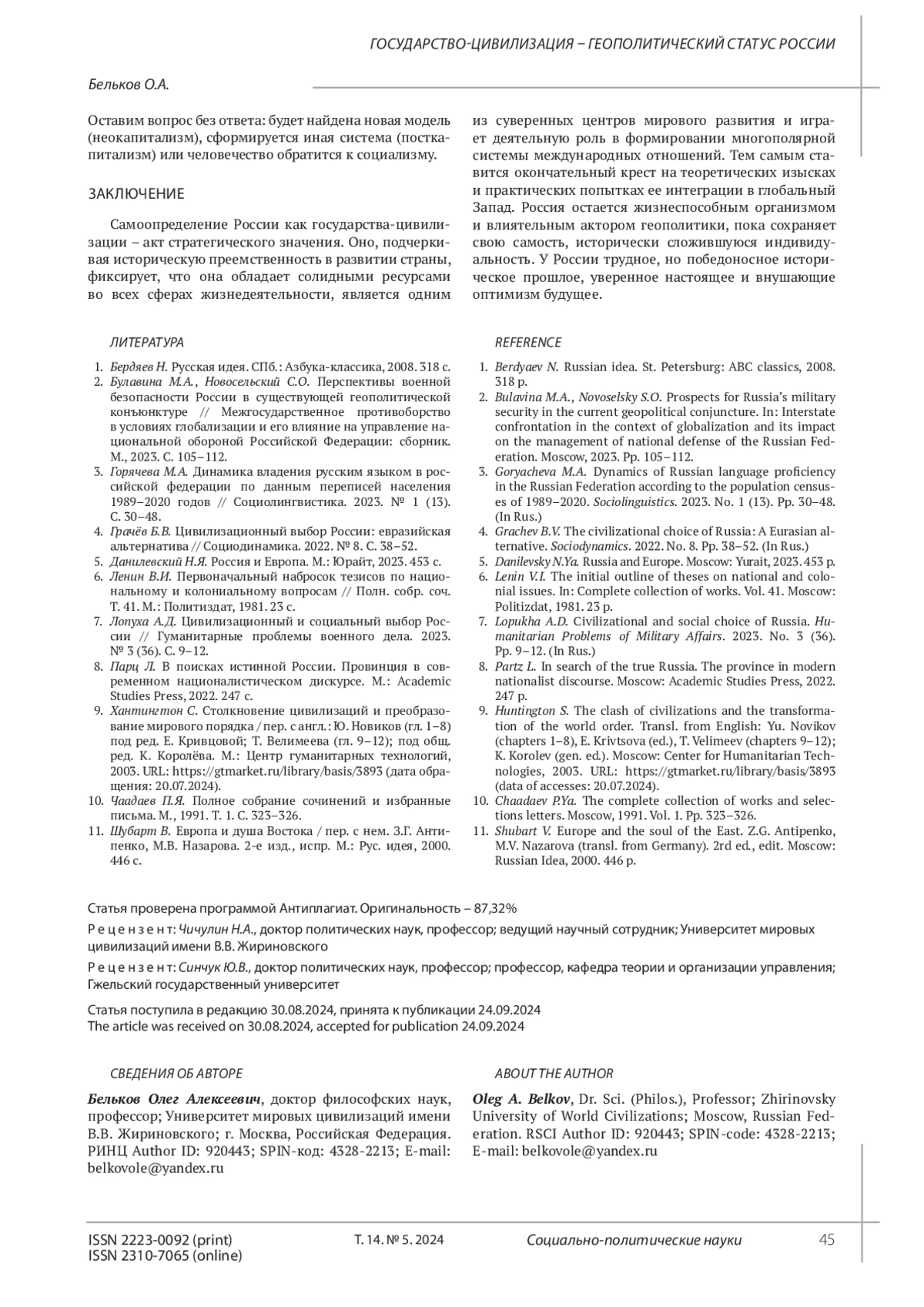 4. 	Грачёв Б.В. Цивилизационный выбор России: евразийская альтернатива // Социодинамика. 2022. № 8. С. 38-52. EDN: KLGGIM