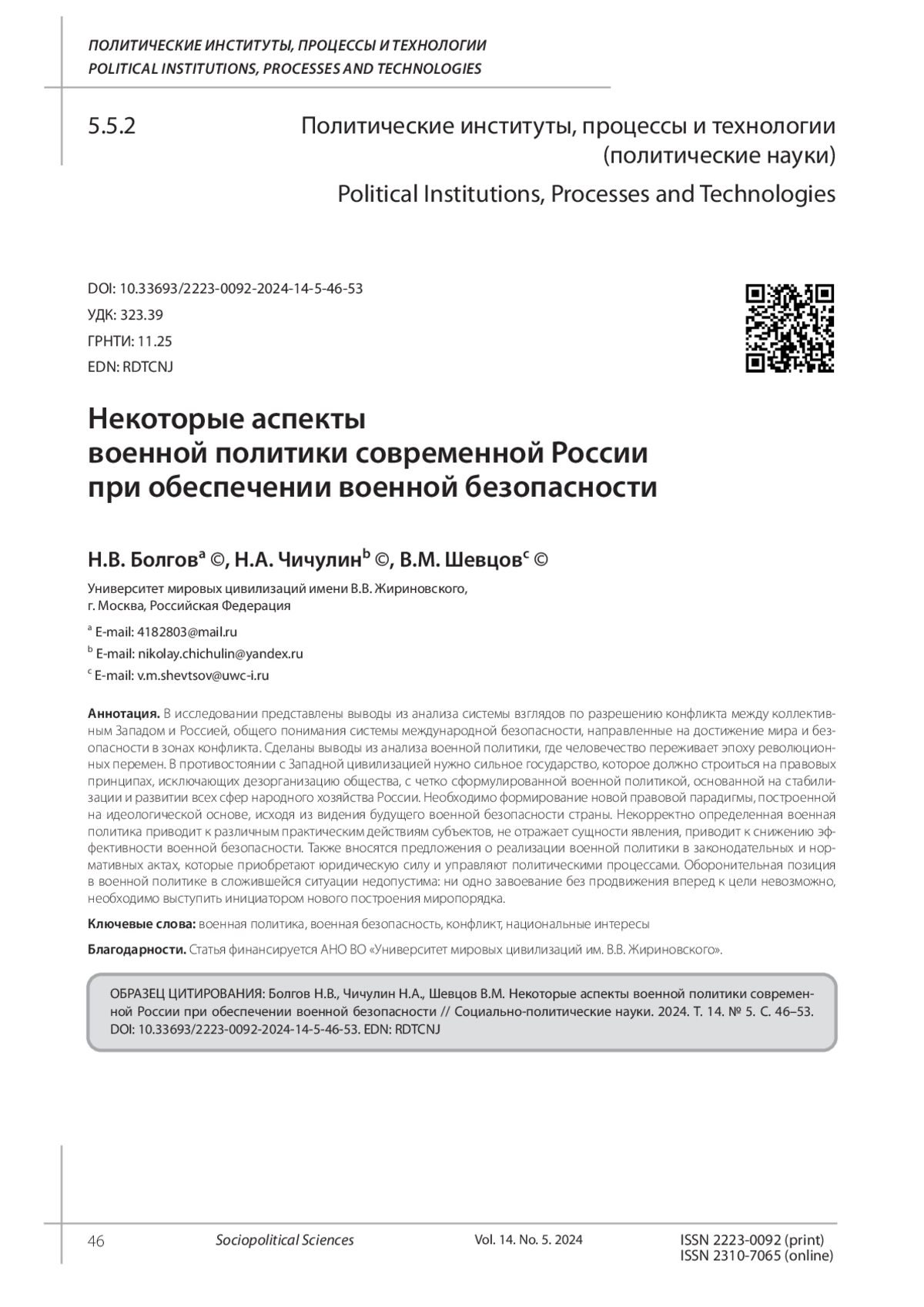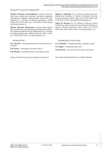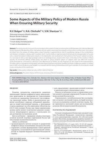 Bulavina M.A., Novoselsky S.O. Prospects for Russia’s military security in the current geopolitical conjuncture. In: Interstate confrontation in the context of globalization and its impact on the management of national defense of the Russian Federation. Collection. Moscow, 2023. Pp. 105-112.