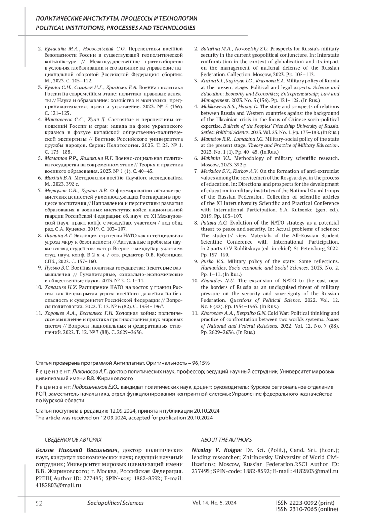 2. Булавина М.А., Новосельский С.О. Перспективы военной безопасности России в существующей геополитической конъюнктуре // Межгосударственное противоборство в условиях глобализации и его влияние на управление национальной обороной Российской Федерации: сборник. М., 2023. С. 105-112. EDN: RQTQDP