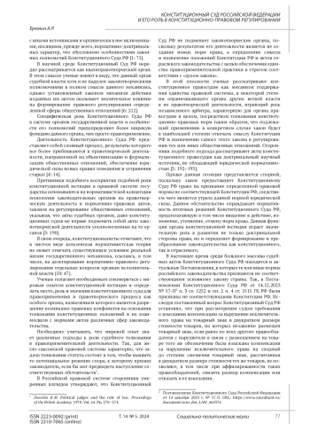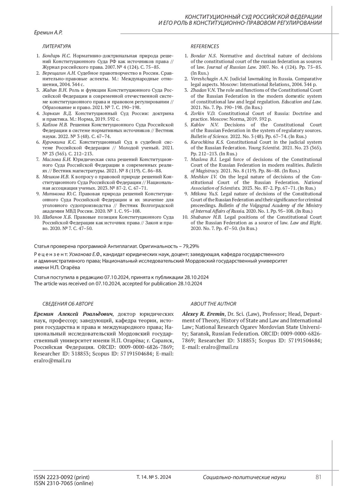 9. 	Митькова Ю.С. Правовая природа решений Конституционного Суда Российской Федерации и их значение для уголовного судопроизводства // Вестник Волгоградской академии МВД России. 2020. № 1. С. 95-108. EDN: EFSQRL