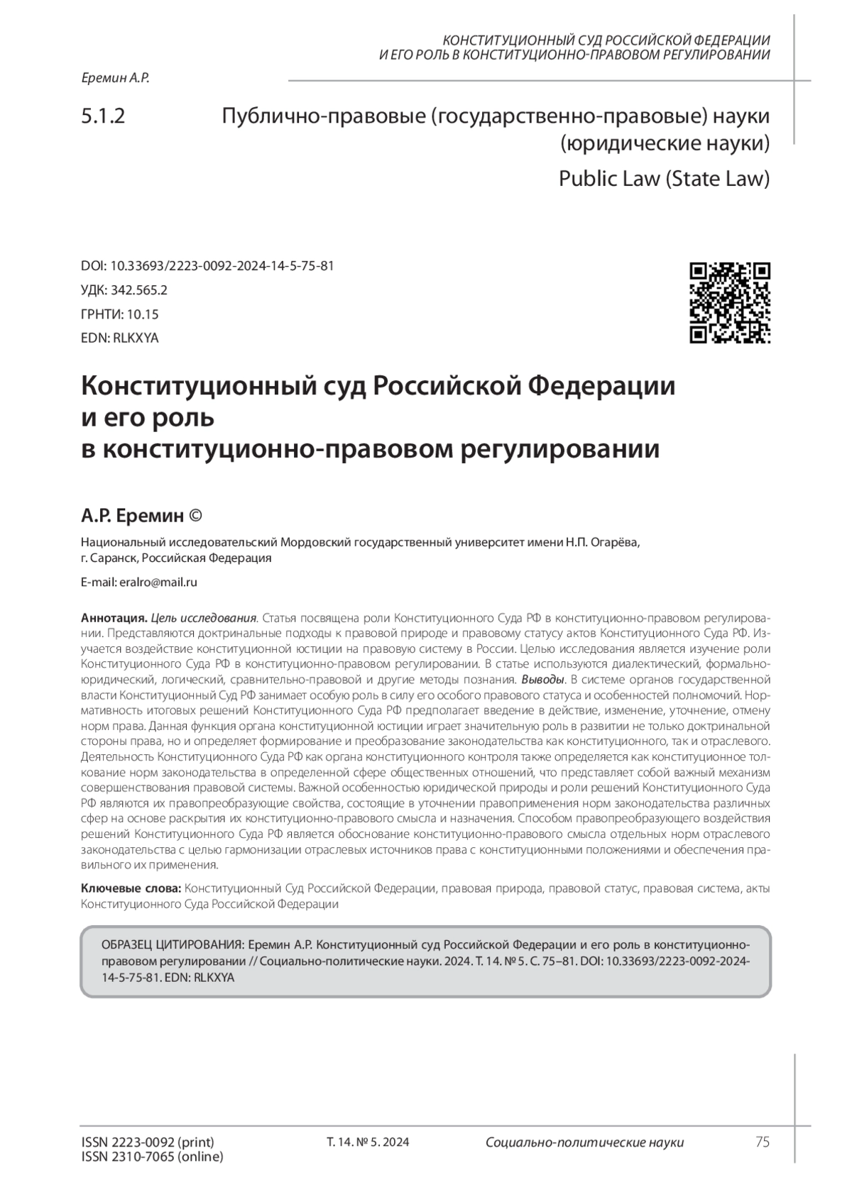 Zhadan V.N. The role and functions of the Constitutional Court of the Russian Federation in the modern domestic system of constitutional law and legal regulation. Education and Law. 2021. No. 7. Pp. 190-198. (In Rus.). EDN: AFNCUF