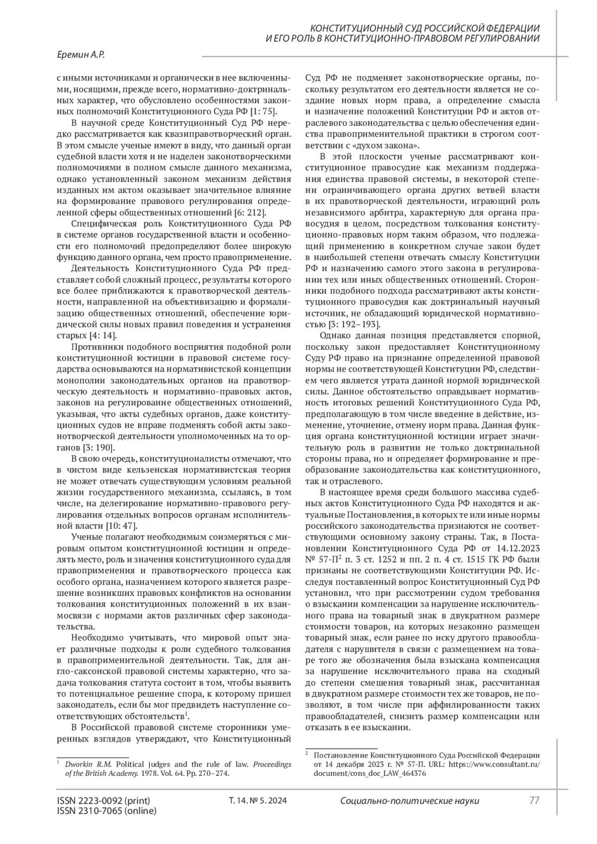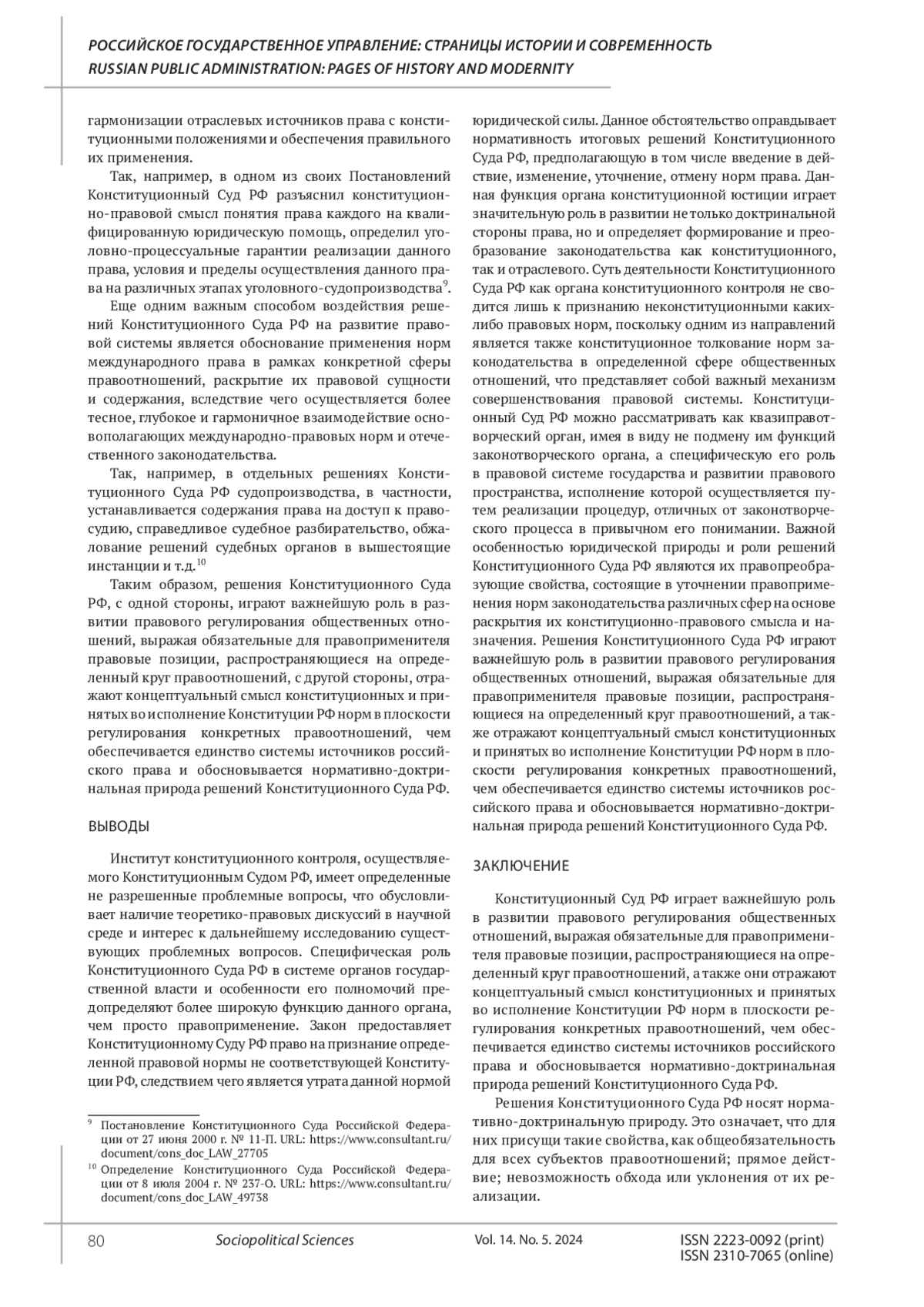 8. 	Мешков И.В. К вопросу о правовой природе решений Конституционного Суда Российской Федерации // Национальная ассоциация ученых. 2023. № 87-2. С. 67-71. EDN: KIBEOJ