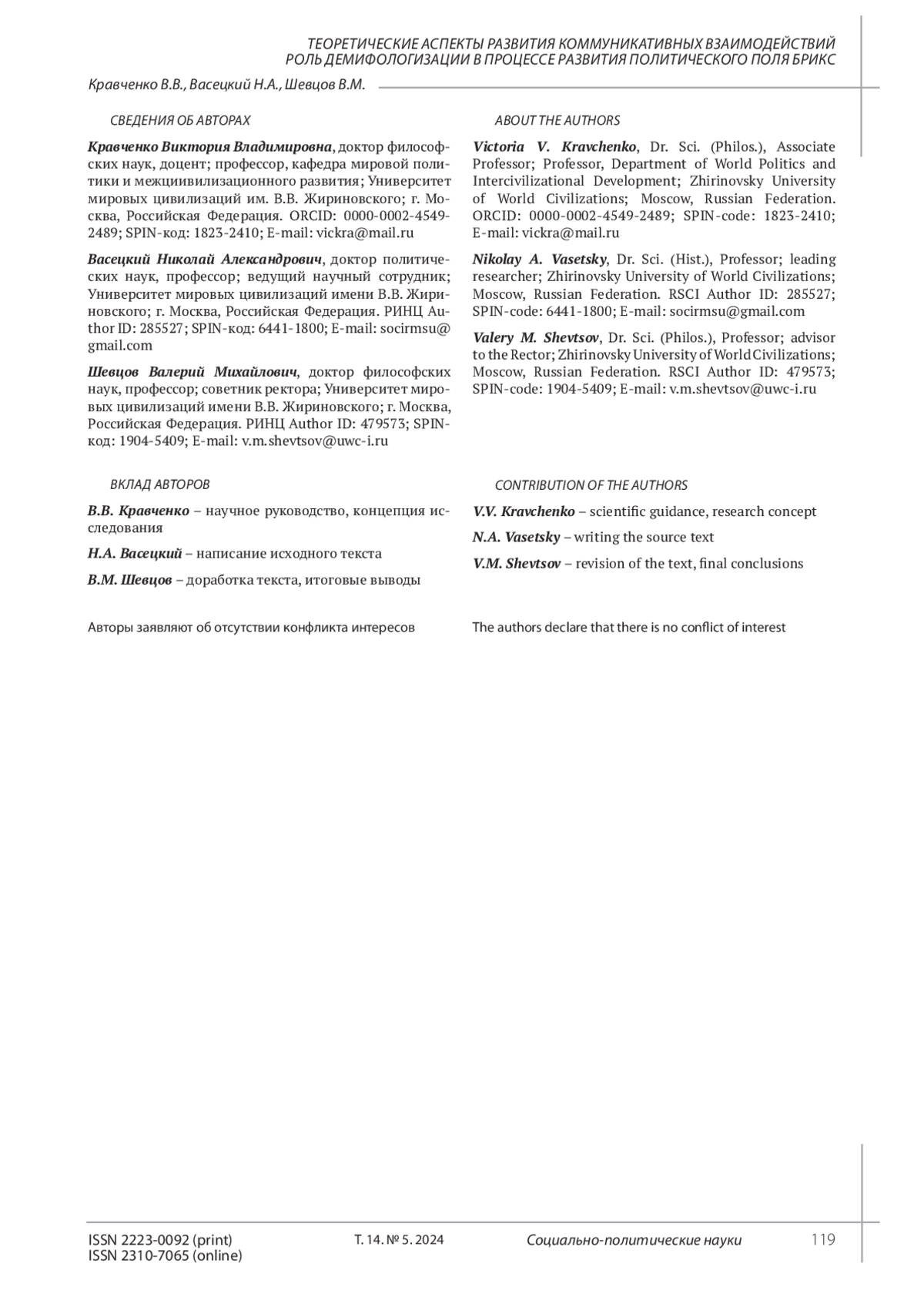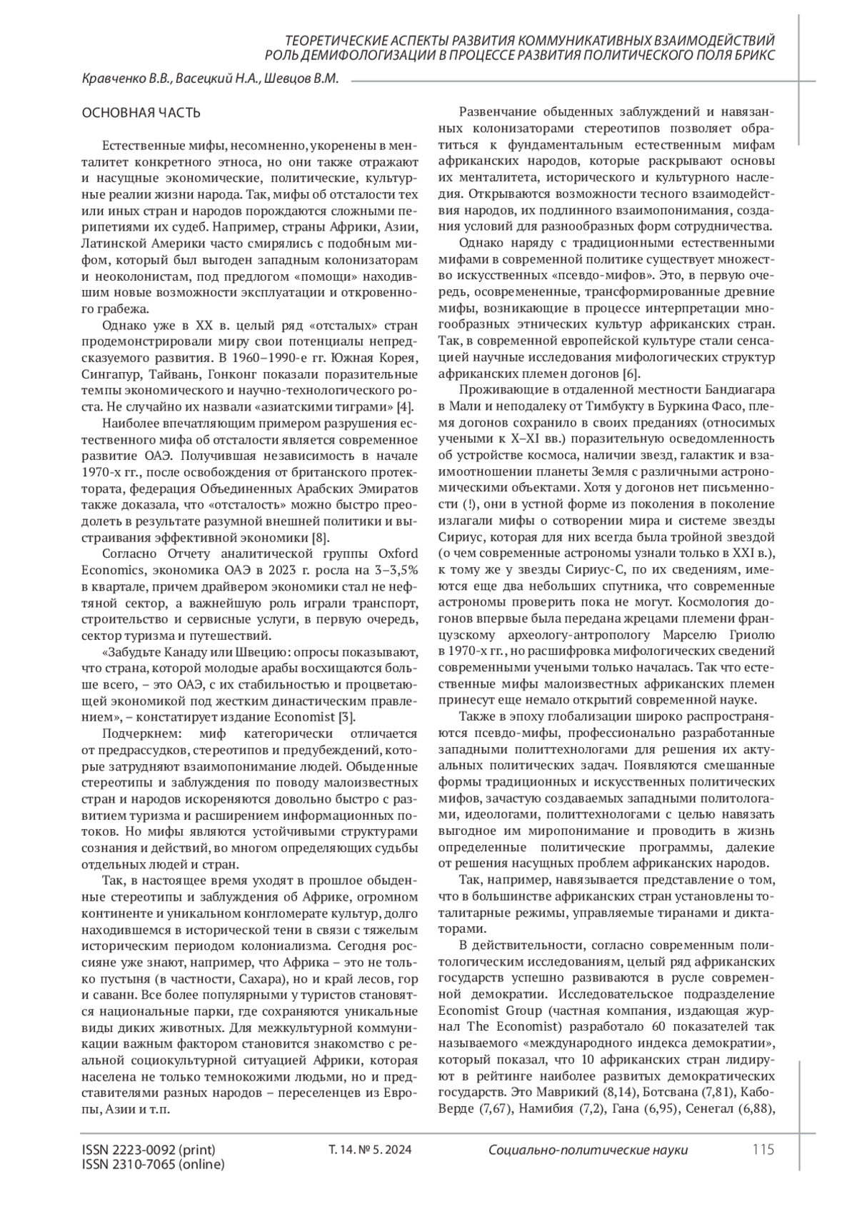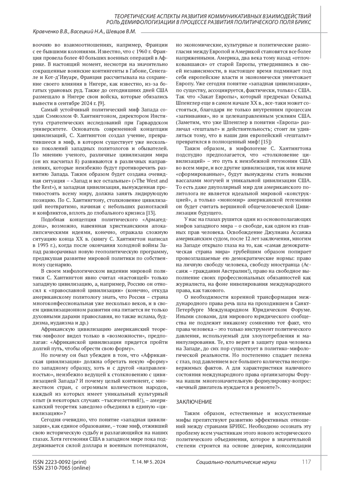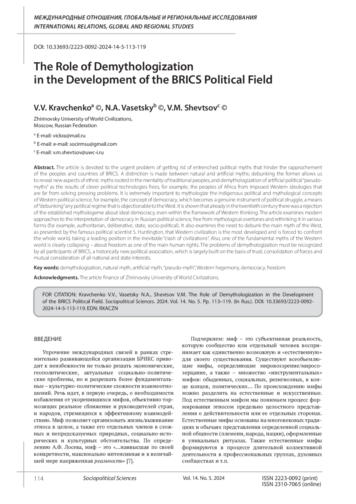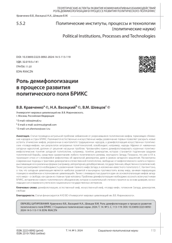 Статья посвящена актуальной проблеме избавления от укоренившихся политических мифов, тормозящих сближение народов и стран БРИКС. Различаются естественные и искусственные мифы; развенчание первых позволяет раскрыть новые аспекты этнических мифов, укорененных в менталитете традиционных народов, а демифологизация искусственных политических «псевдо-мифов», как результатов хитроумных политтехнологий, освобождает, например, народы Африки от навязанных западных идеологий, далеких от решения насущных проблем. Чрезвычайно важно демифологизировать коренные политико-мифологические понятия западной политологии, например, понятие демократии, которое становится подлинным орудием политической борьбы, средством «развенчания» любого политического режима, неугодного Западу. Показано, что уже в ХХ в. произошел отказ от сложившейся мифологемы об идеальной демократии, даже в рамках западного мышления. Рассмотрены современные подходы к трактовке демократии в отечественной политологии, свободные от мифологического налета и переосмысливающие ее в различных формах (например, авторитарная, делиберативная, государственная, общественно-политическая). Также рассматривается необходимость развенчания главного мифа Запада, в изложении известного политолога С. Хантингтона, о том, что западная цивилизация является наиболее развитой и вынуждена противостоять всему миру, занимая лидирующую позицию в неизбежном «столкновение цивилизаций». Также с очевидностью рушится один из основополагающих мифов западного мира - о свободе, как одном из главных прав человека. Проблемы демифологизации необходимо осознать всем участникам БРИКС, исторически нового политического объединения, которое в значительной степени строится на основе доверия, консолидации сил и взаимного учета всех национально-государственных интересов.