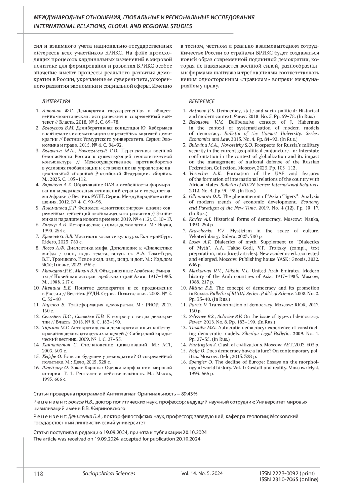 1. 	Антонов Ф.С. Демократия государственная и общественно-политическая: исторический и современный контекст // Власть. 2018. № 5. С. 69-78. EDN: OSXIAL