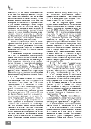 Материалы и методы. Исследование построено на анализе ставших доступными в настоящее время, ранее засекреченных документов, включающих направленные в ЦК КПСС докладные записки, отчеты ведущих ученых, чиновников, ответственных за научно-техническое развитие страны и др. Методологической базой исследования стала теория модернизации.