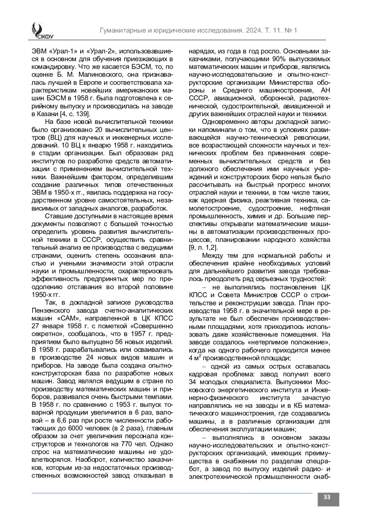 Введение. Оценки ряда известных экономистов и историков относительно реализуемой в 1950-е гг. научно-технической политики прямо противоположны. Часть авторов оценивает этот период в качестве подлинного расцвета, другие утверждают, что уже в 1950-е гг. проявилась неспособность страны к преодолению научно-технического отставания от ведущих западных стран. Актуальность публикации определяется необходимостью аккумуляции всего позитивного из исторического опыта с целью обретения технологического суверенитета. Целью исследования является анализ сообщений, направленных руководству страны представителями части советской научной элиты и руководителей отдельных ведомств, отражающих состояние вычислительной техники в СССР к середине 1950-х гг. Новизна публикации состоит в изучении на основе впервые введенных в научный оборот документов, позволяющих глубже и достовернее исследовать проблему эволюции государственной политики в сфере развития вычислительной техники в 1950-е гг.