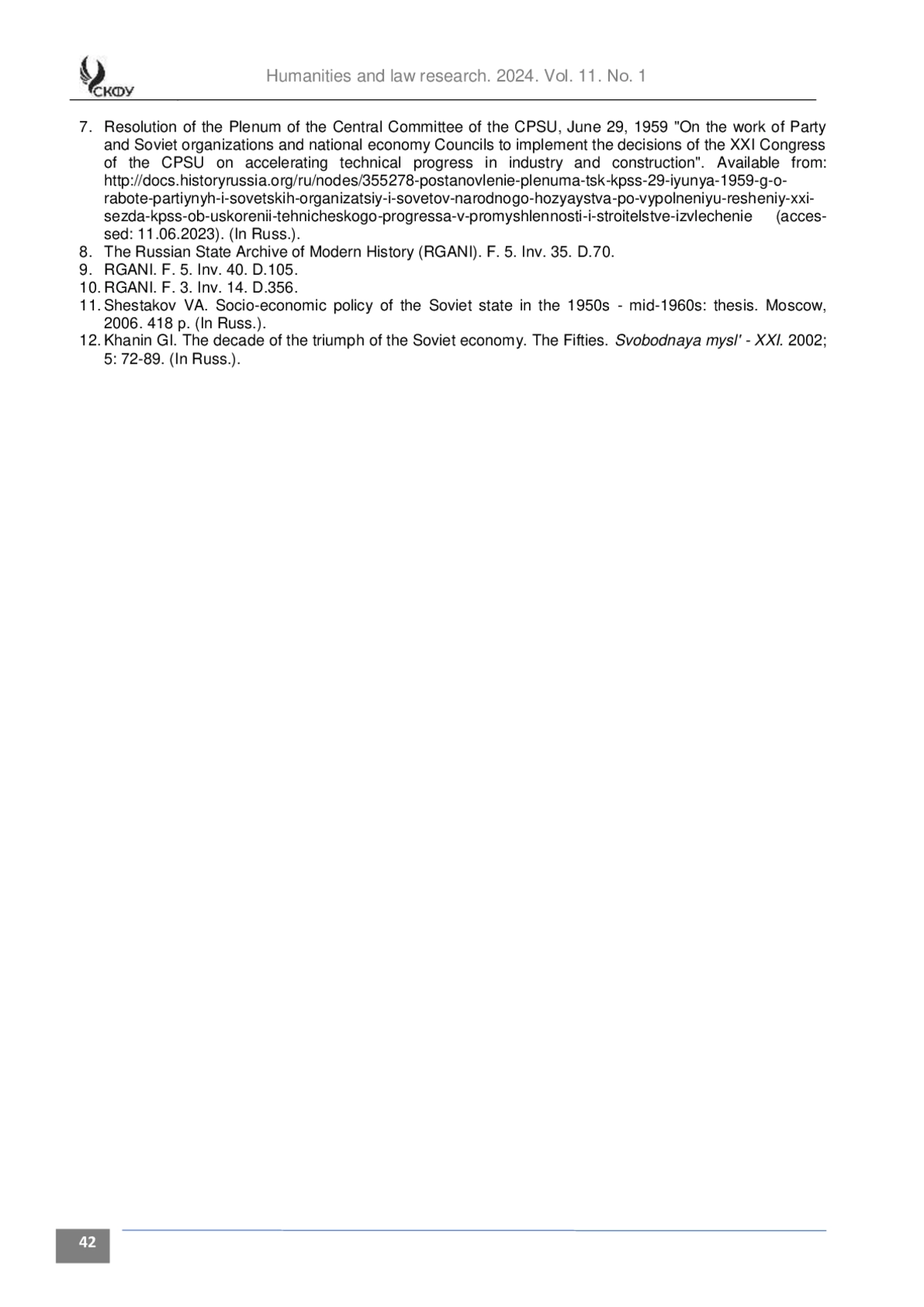 7. Постановление Пленума ЦК КПСС, 29 июня 1959 г. «О работе партийных и советских организаций и советов народного хозяйства по выполнению решений XXI съезда КПСС об ускорении технического прогресса в промышленности и строительстве». URL: http://docs.historyrussia.org/ru/nodes/355278-postanovlenie-plenuma-tsk-kpss-29-iyunya-1959-g-o-rabote-partiynyh-i-sovetskihorganizatsiy-i-sovetov-narodnogo-hozyaystva-po-vypolneniyu-resheniy-xxi-sezda-kpss-ob-uskoreniitehnicheskogo-progressa-v-promyshlennosti-i-stroitelstve-izvlechenie (дата обращения: 11.06.2023)