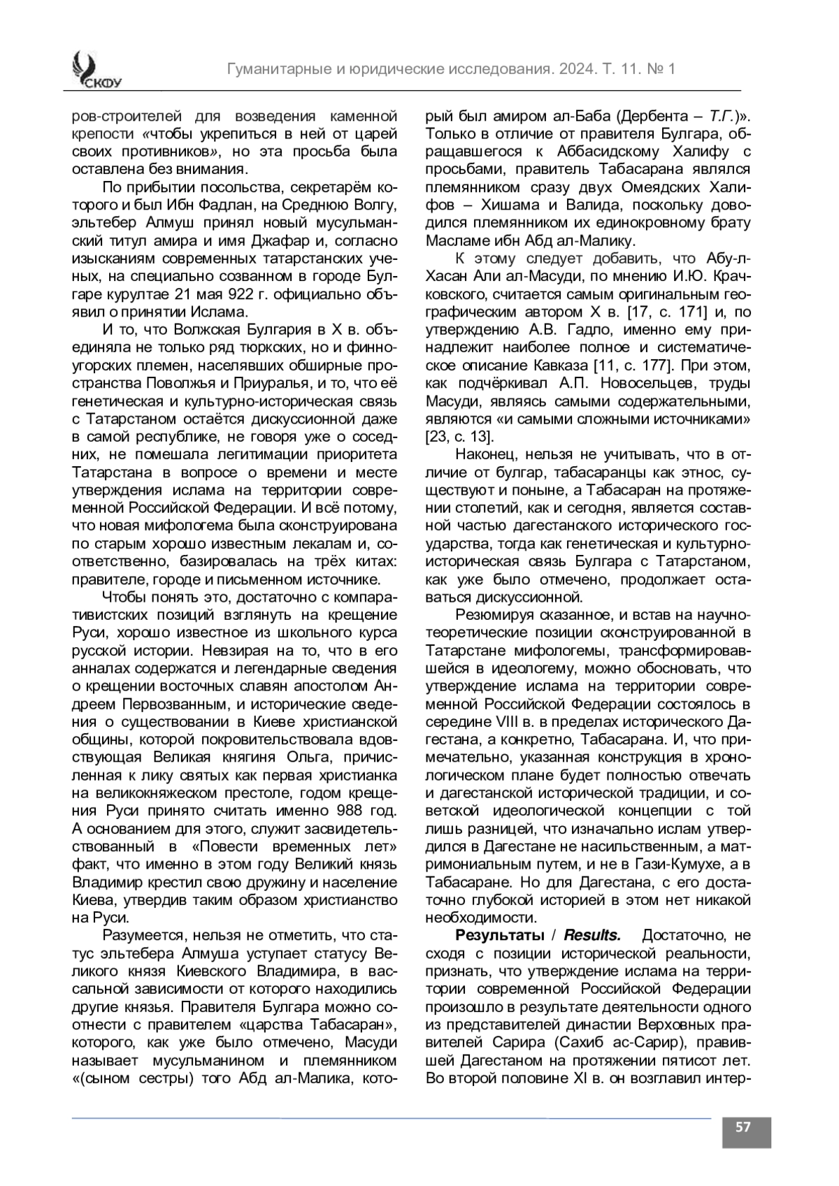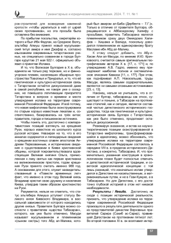 Анализ. Сам факт утверждения мусульманской религии рассматривается в статье как целенаправленный процесс, инициированный и проводимый именно государственной властью в рамках определенной этнополитической и этнотерриториальной общности, непрерывно существующей на территории Российской Федерации до настоящего времени. В статье последовательно проводится мысль, что рассматриваемого в ней вопроса могло и не возникнуть, если бы отечественная историческая наука в последние десятилетия не оказалась в значительной мере под влиянием этнического мифотворчества, потеснившего добросовестный, взвешенный подход к историческим фактам, издавна присутствующим в научном обороте.