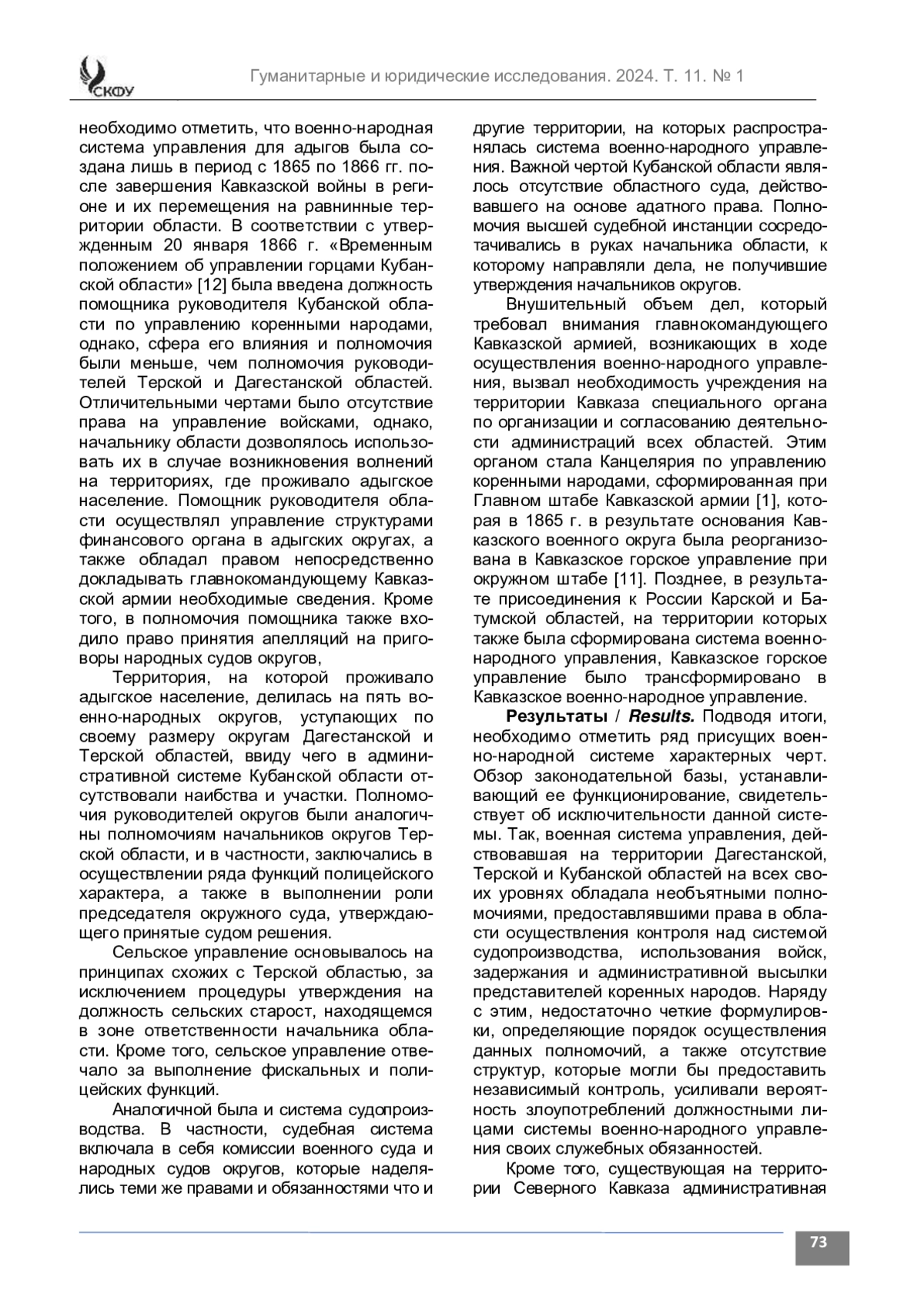Материалы и методы. Источниковую базу настоящего исследования составили архивные материалы и опубликованные источники, относящиеся к различным этапам исследуемого периода. Важное значение также имели материалы, представленные в таких крупнейших изданиях как «Полное собрание законов Российской империи» и «Акты, собранные Кавказской Археологической комиссией». В качестве приемов историко-политического исследования применялись принципы научности и историзма, а также использовались такие научные методы как историко-системный, историко-сравнительный и дескриптивный, позволившие более глубоко понять исторические процессы, протекавшие на Северном Кавказе в рассматриваемый период.