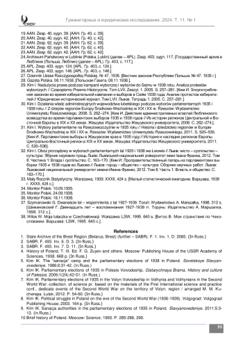 29. Kim I. Nadużycia prawa podczas kampanii wyborczej i wyborów do Sejmu w 1938 roku. Analiza protestów wyborczych // Czasopismo Prawno-Historyczne. Tom LVII. Zeszyt. 1. 2005. S. 257-281. [Ким И. Злоупотребления законом во время избирательной кампании и выборов в Сейм 1938 года. Анализ протестов избирателей // Юридически-исторический журнал. Том LVII. Львов. Тетрадь 1. 2005. С. 257-281.]