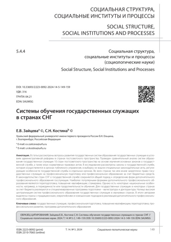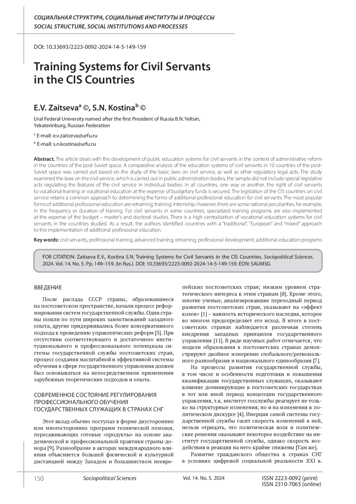 Maskaleva O.S. Training and professional development of civil servants in the countries of the former USSR. Gosudarstvennoe upravlenie. Elektronnyj vestnik. 2012. No. 35. P. 20. (In Rus.). EDN: PLHDDZ