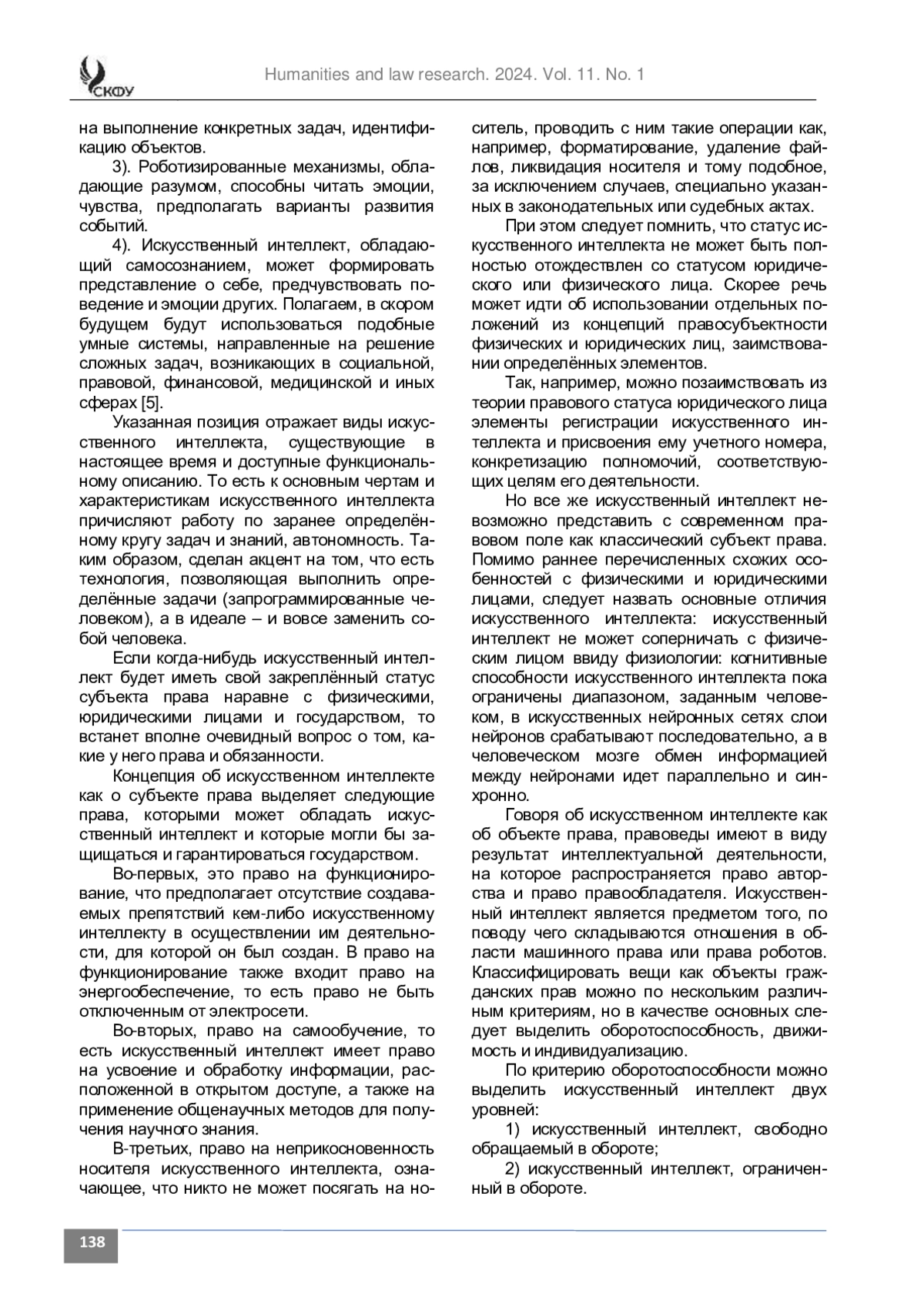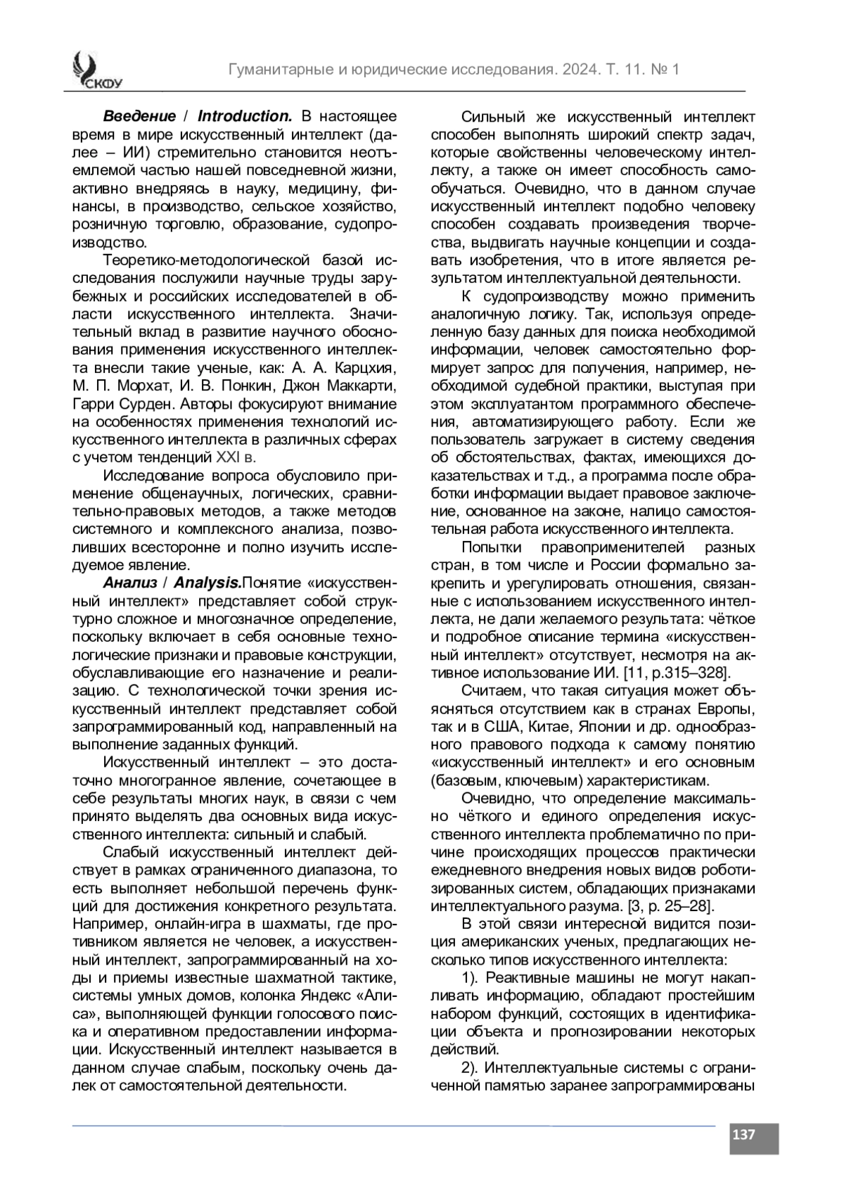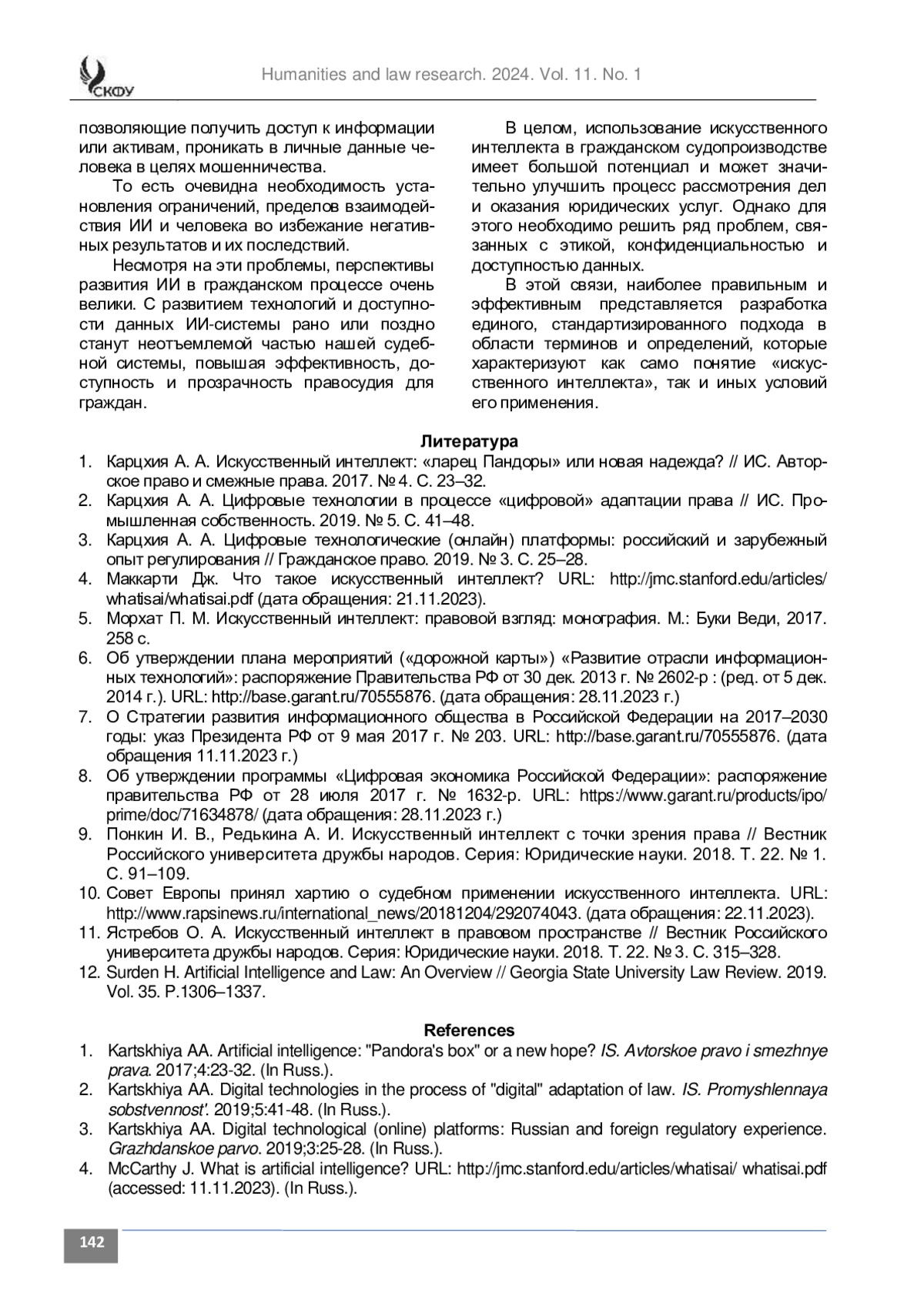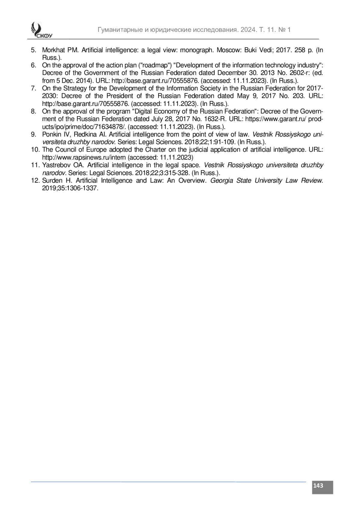 11. Ястребов О. А. Искусственный интеллект в правовом пространстве // Вестник Российского университета дружбы народов. Серия: Юридические науки. 2018. Т. 22. № 3. С. 315-328.