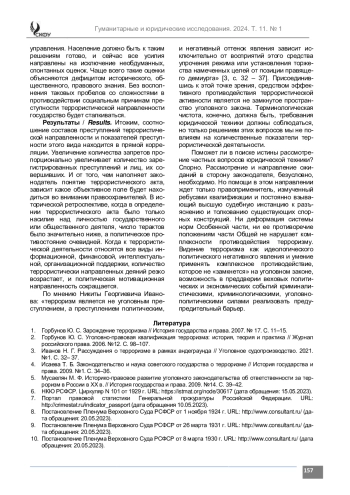 2. Горбунов Ю. С. Уголовно-правовая квалификация терроризма: история, теория и практика // Журнал российского права. 2006. №12. С. 98-107.