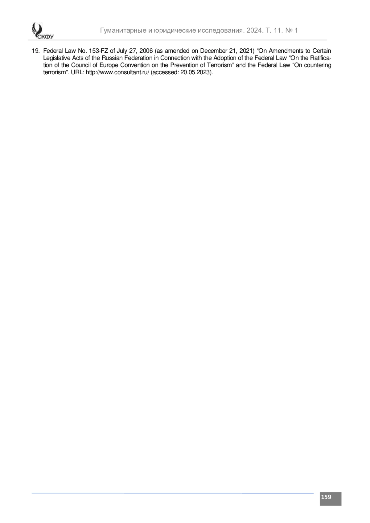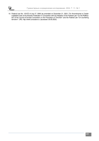 19. Федеральный закон от 27.07.2006 № 153-ФЗ (ред. от 21.12.2021) «О внесении изменений в отдельные законодательные акты Российской Федерации в связи с принятием Федерального закона «О ратификации конвенции совета Европы о предупреждении терроризма» и Федерального закона «О противодействии терроризму». URL: http://www.consultant.ru (дата обращения: 20.05.2023).