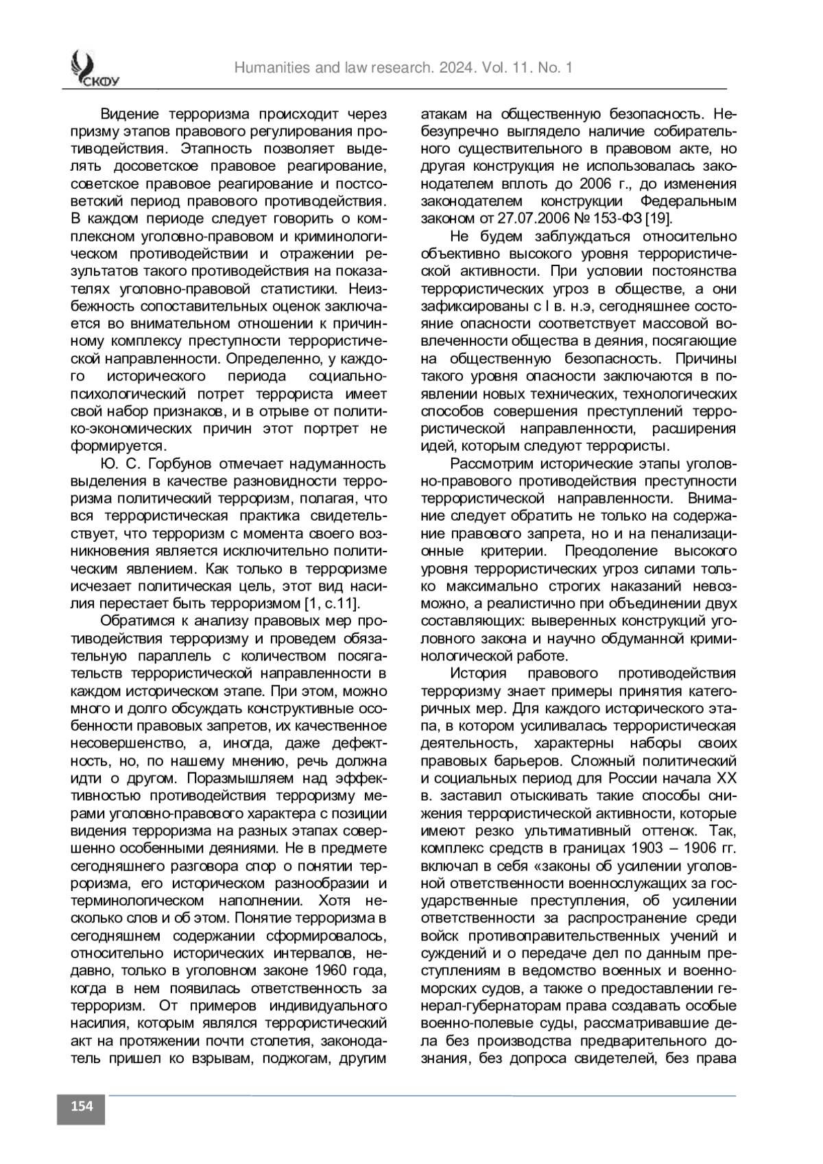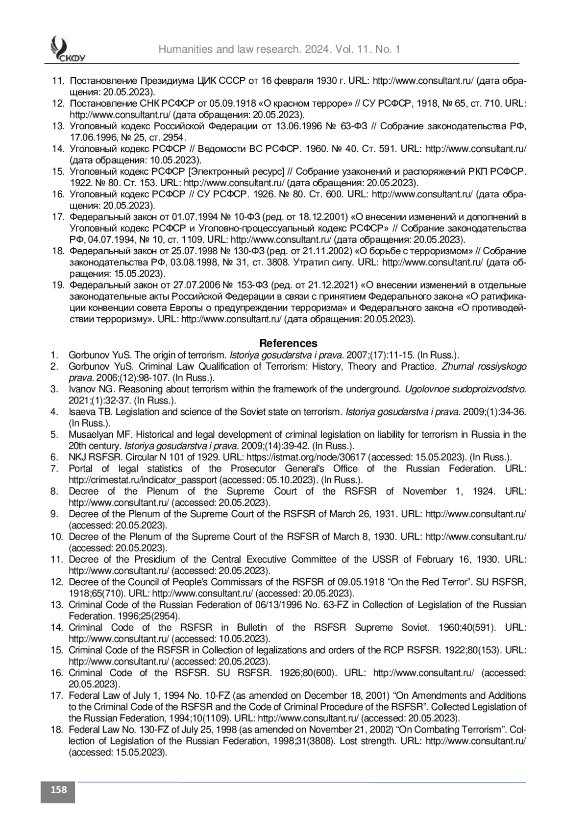 1. Горбунов Ю. С. Зарождение терроризма // История государства и права. 2007. № 17. C. 11-15.