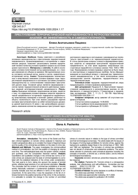 Введение. Нормы советского и российского уголовного законодательства о преступлениях террористической направленности, проанализированные в историческом и современном ракурсах, позволяют рассматривать влияние юридический техники и качества уголовно-правового запрета на состояние уровня преступности.