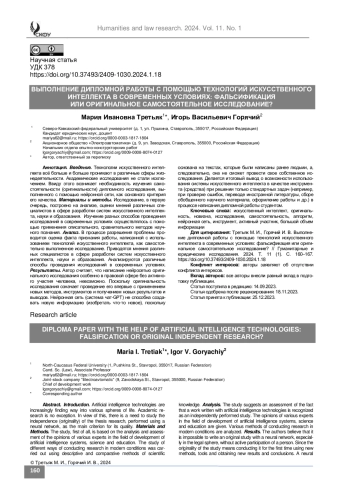 Введение. Технологии искусственного интеллекта всё больше и больше проникают в различные сферы жизнедеятельности. Академические исследования не стали исключением. Ввиду этого возникает необходимость изучения самостоятельности (оригинальности) дипломного исследования, выполненного с помощью нейронной сети, как основного критерия его качества.