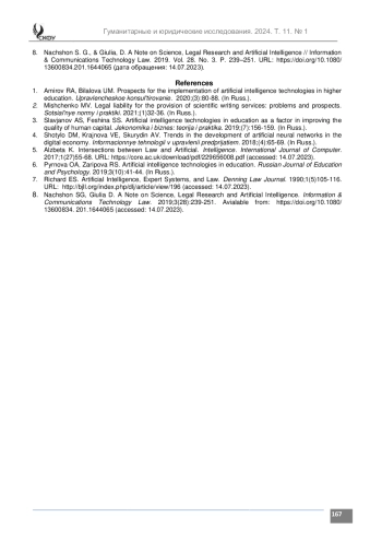 8. Nachshon S. G., & Giulia, D. A Note on Science, Legal Research and Artificial Intelligence // Information & Communications Technology Law. 2019. Vol. 28. No. 3. P. 239-251. URL: https://doi.org/10.1080/13600834.201.1644065 (дата обращения: 14.07.2023).